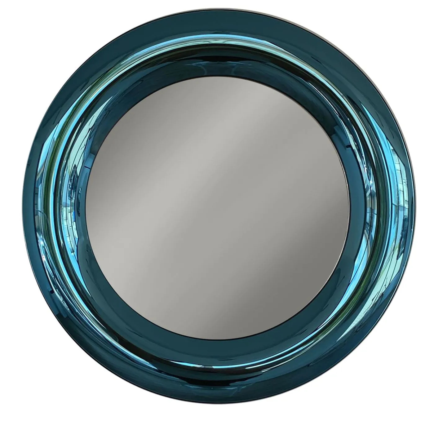 Vetro extrachiaro e colorato, argentatura artigianale. Riflesso infinito e leggero, lo specchio riesce a trasmettere tranquillità agli occhi di chi lo guarda. Specchio composto da due elementi. Specchio centrale in vetro piano, specchio convesso e cornice curva. Colori disponibili: Argento, Rame lucido, Bronzo, Blu, Nero.