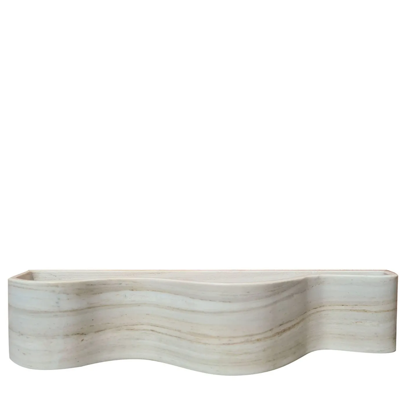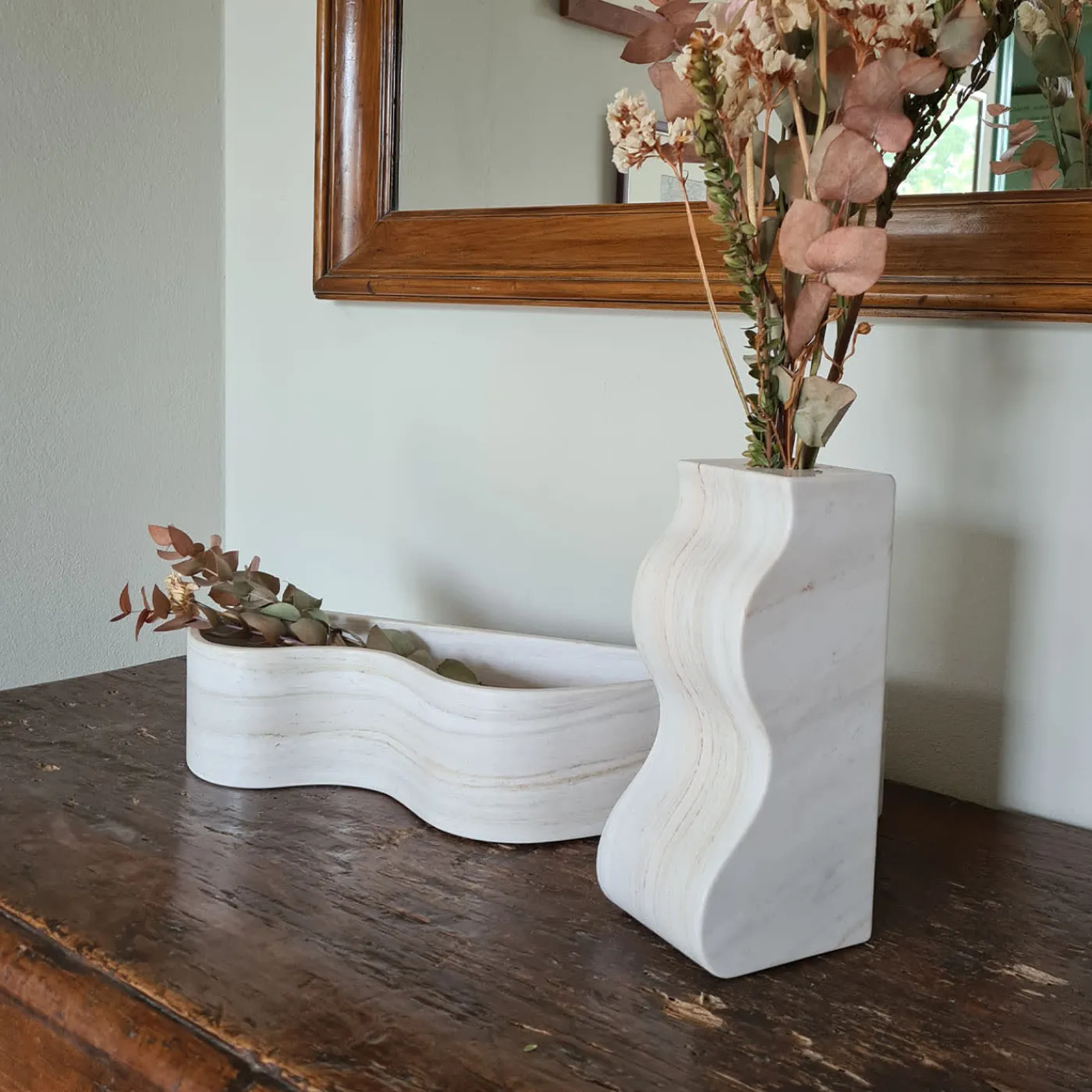 Una videopoche scultorea per completare consolle d’ingresso o scrivanie o un vaso dove originariamente erano disposti fiori secchi, questo pezzo è stato ispirato dalle curve naturali delle onde. Realizzato in pregiato marmo italiano Grigio Prali, ha debuttato insieme al vaso a due onde alla Settimana del Design di Milano 2023. Un abile processo di incisione a mano seguito da una minuziosa fase di levigatura manuale.