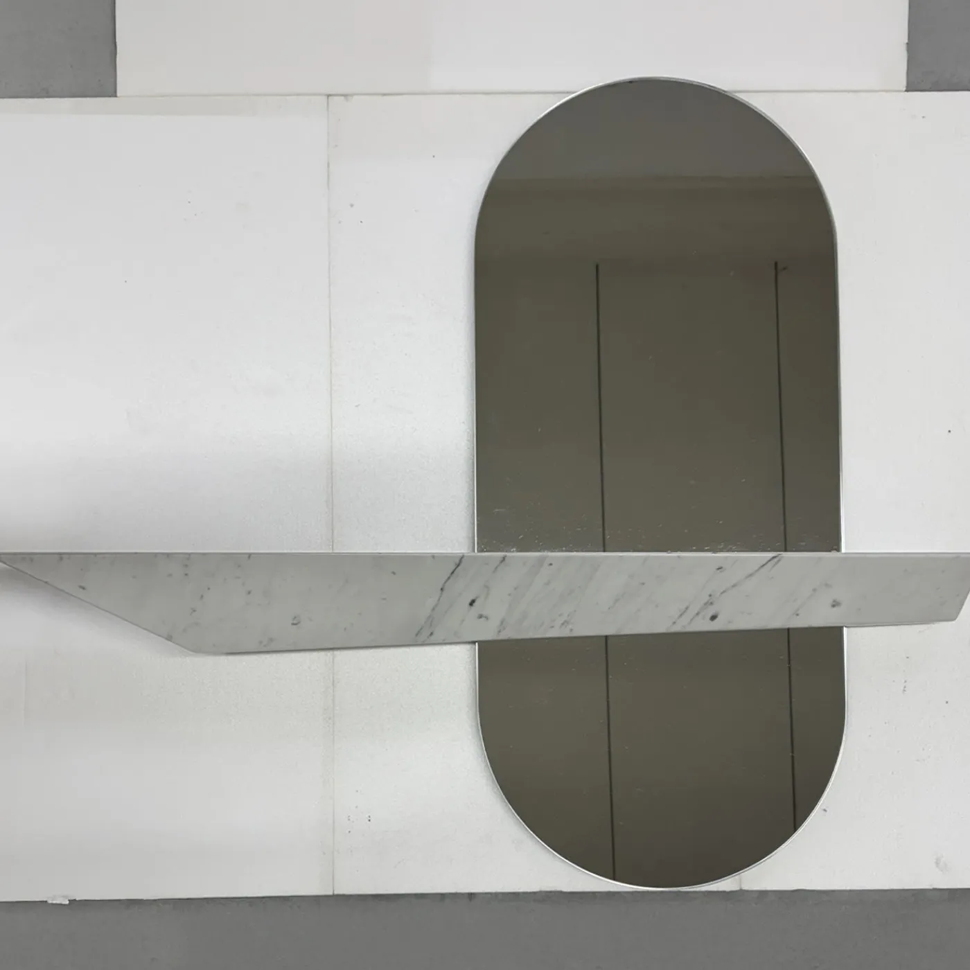 Lo specchio da parete Stadium combina un design minimalista con materiali di lusso. Lo specchio ha una forma rettangolare allungata con bordi arrotondati, ispirata a uno stadio. Include una mensola artigianale in marmo bianco di Carrara, progettata come un prisma leggero. La mensola è assemblata con lastre e si adatta perfettamente allo specchio. Montata su una barra di metallo, può essere personalizzata con finiture lucide o satinate e vari colori di marmo. Ogni pezzo è realizzato a mano in modo unico, con lievi variazioni.