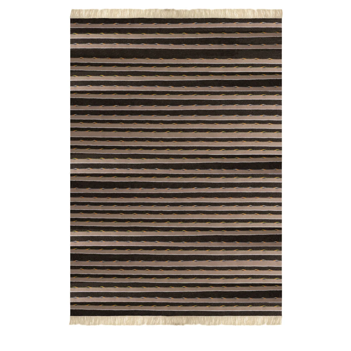 Questo tappeto moderno e sofisticato è un’interpretazione contemporanea dei disegni tradizionali sardi. Realizzato interamente in lana sarda sottoposta a trattamento antitarme, questo tappeto è stato realizzato interamente a mano con metodi antichi su telaio verticale. È realizzato su ordinazione e richiede 30 giorni dall’acquisto per essere completato. È possibile esporre entrambi i lati. Questo elegante disegno simboleggia la forza della natura, con linee orizzontali su sfondo nero decorate con piccoli elementi che alludono a una moltitudine di germogli (da cui il nome del pezzo in italiano).