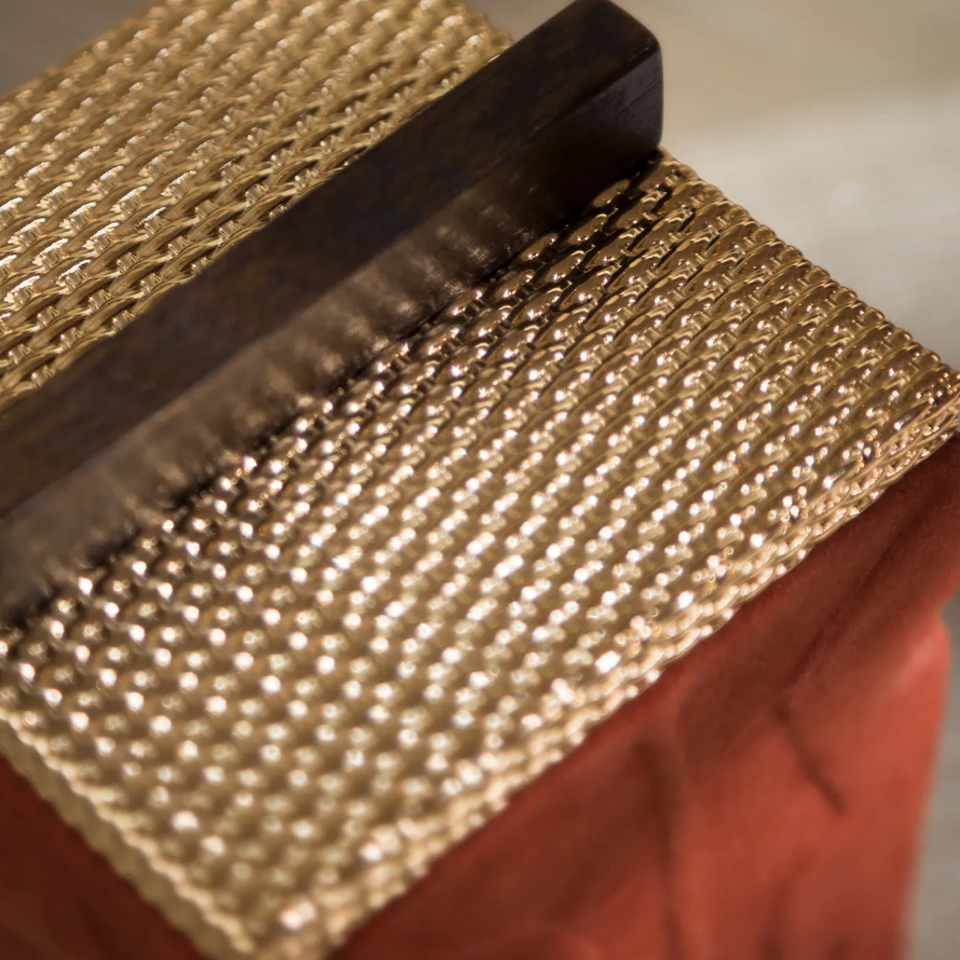 Volumi geometrici puri che evocano l’architettura razionalista si fondono con accenti artistici primitivi in questa preziosa scatola. Il motivo a rilievo che anima la struttura in massello di noce canaletto si ispira alle figure precolombiane, mentre la trama a rete che arricchisce il coperchio in metallo rifinito in ottone è interrotta da una maniglia lineare in legno che riprende i volumi rigorosi tipici dello stile razionalista. Un lussuoso rivestimento in pelle di nabuk color corallo completa il design.