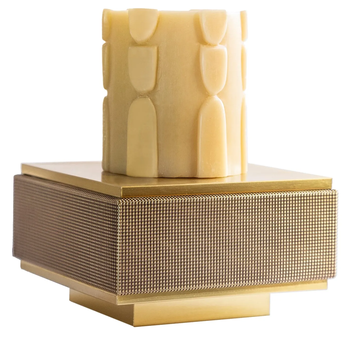 L’elegante base di questo prodotto è realizzata in ottone e la superficie principale è stata trattata con tecniche di brunitura e presenta una texture a diamante. La cera di paraffina con oli essenziali di Ambra e Oud garantisce alla candela un profumo prezioso.
