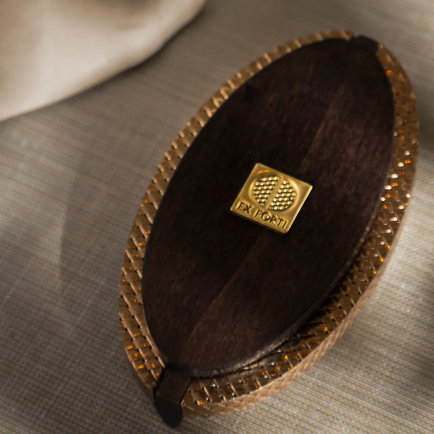 Un’abile sintesi di artigianato sartoriale e squisiti riferimenti artistici contraddistingue il ricco look di questo cofanetto, una soluzione preziosa per raccogliere i gioielli o i trucchi preferiti. Il pomello lineare in legno che completa la maglia di ottone abbagliante del coperchio richiama il rigore delle linee brutaliste, mentre il motivo in rilievo che anima la cornice in noce canaletto – rivestita in pelle Nubuck beige – raffigura figure stilizzate in omaggio all’arte precolombiana.