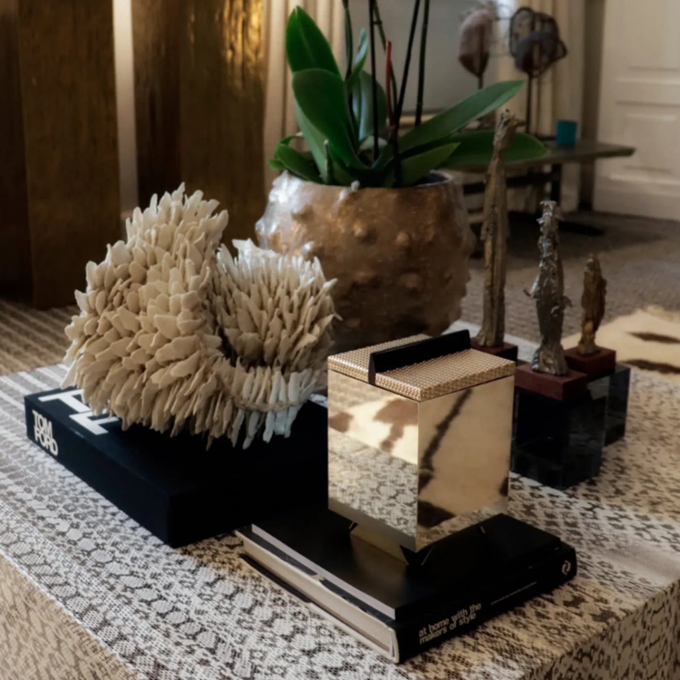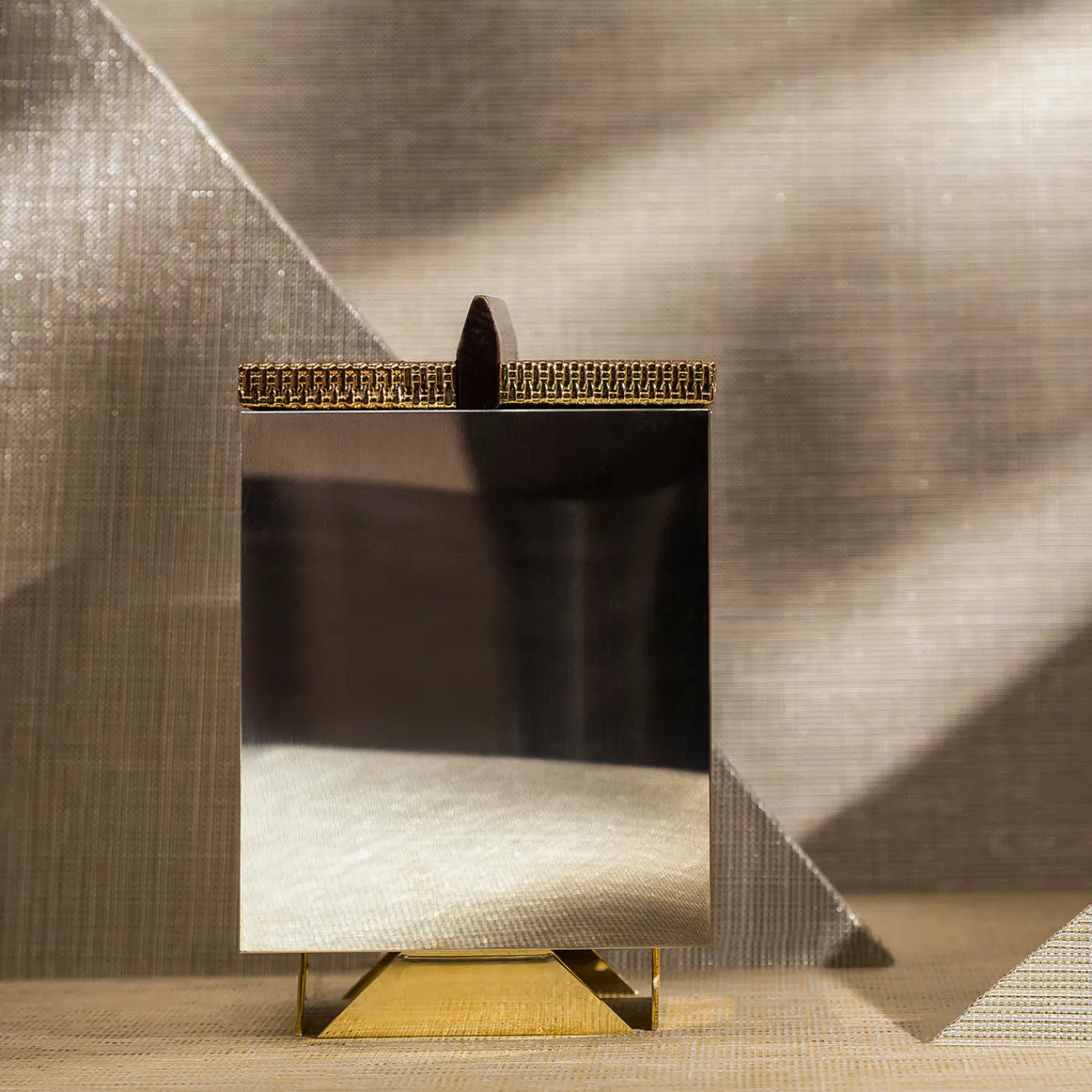 Lussuoso e splendidamente riflettente, questo raffinato cofanetto dalla geometria rigorosa arricchirà qualsiasi scrivania o vanity con il suo look deciso. La solida struttura in Canaletto è avvolta da placche in alpacca, la cui caratteristica lucentezza si armonizza con l’aspetto scintillante del coperchio in ottone, che presenta una piacevole trama a rete in contrasto con il lineare pomolo in legno scuro. La base è composta da elementi trapezoidali in metallo finitura ottone, omaggio alle piramidi Maya.