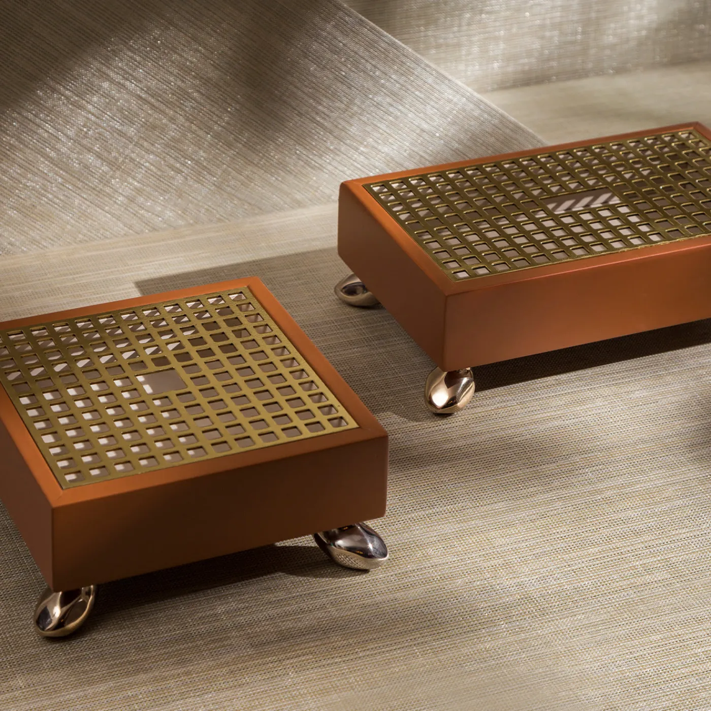Esclusiva e audace, questa superba scatola aggiungerà un tocco di lusso a tavolini o comò, dove potrà raccogliere bonbon o gioielli con un’eleganza senza pari. Quattro scintillanti piedini in metallo sostengono il contenitore in legno laccato marrone, che offre uno spazio ottimizzato grazie ai due contenitori di dimensioni diverse che ne compongono la struttura. Il coperchio luminoso in ottone a forma di griglia è un omaggio al disegno geometrico che caratterizza il pavimento della cattedrale dell’Arcidiocesi di Monaco.