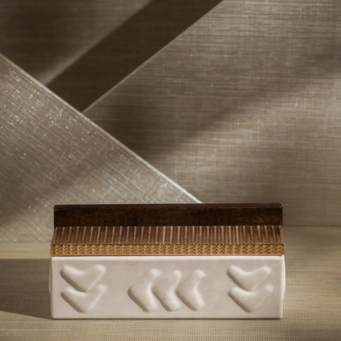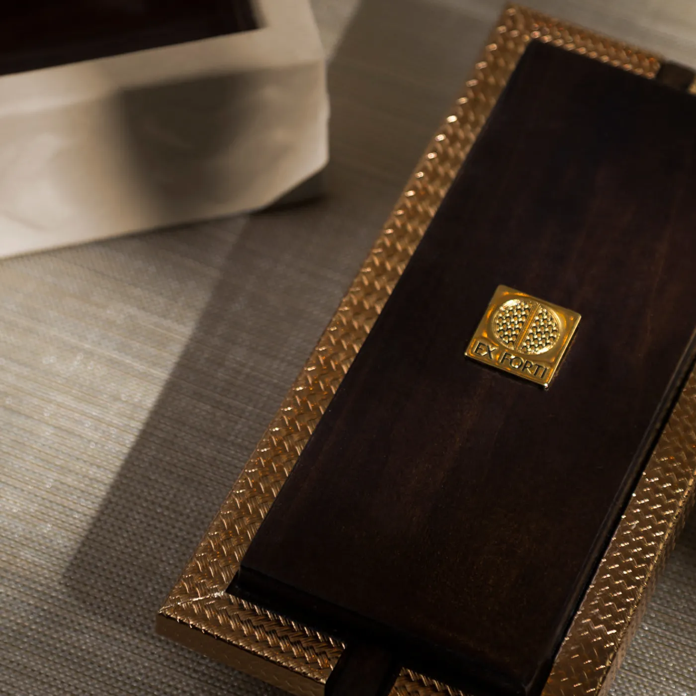 Abilità artigianale e affascinanti tributi a stili artistici lontani si fondono in questo splendido cofanetto, abilmente realizzato a mano in massello di noce canaletto e abbracciato da pelle Nubuck beige. Forme in rilievo prese in prestito dall’arte precolombiana creano l’accattivante texture che caratterizza i lati del cofanetto, le cui curve ammorbidiscono il rigore esibito dal coperchio in ottone a forma di rete e dal lineare pomolo in legno, un omaggio ai volumi razionalisti.