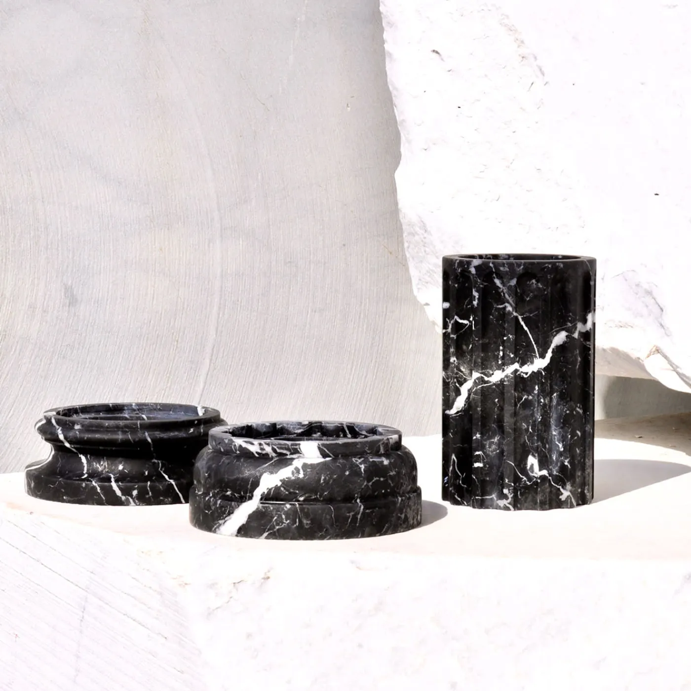 Il nome POR TAN TE sottolinea la natura modulare di questo vaso decorativo, in cui ogni parte può stare da sola come prodotto individuale o essere combinata con le altre per creare un pezzo coeso e multifunzionale. Progettato in collaborazione con SuonareStella, questo vaso è realizzato in marmo nero Maquina, un materiale che conferisce un’eleganza naturale e ogni pezzo è unico grazie alle sue caratteristiche venature. Ogni parte di questo vaso a colonna può essere venduta singolarmente.