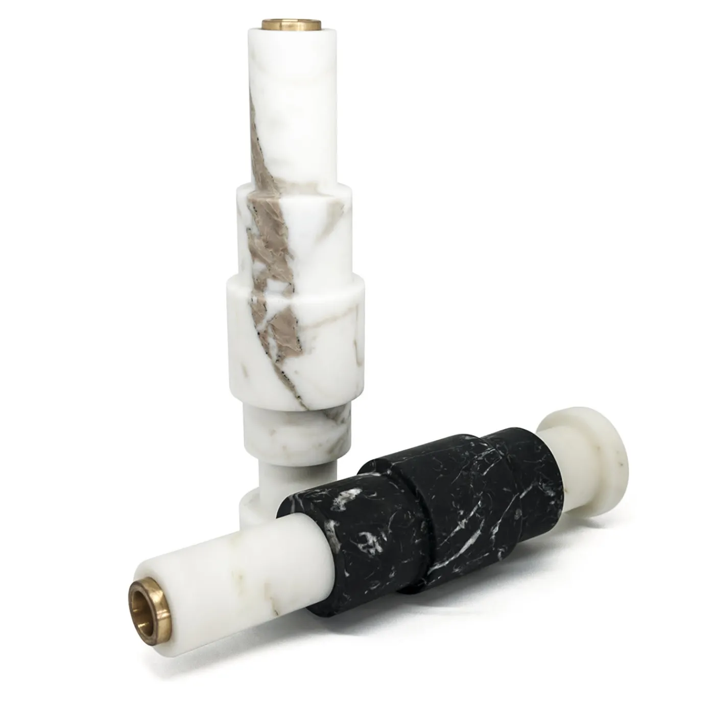 Questo elegante portacandele in marmo bianco di Carrara presenta una silhouette geometrica a gradini e finiture in bronzo. Grazie alle venature uniche del materiale, ogni articolo sarà un pezzo unico garantito. Creato dal designer italiano Jacopo Simonetti, è realizzato a mano da artigiani italiani con tecniche tradizionali che si tramandano da generazioni.