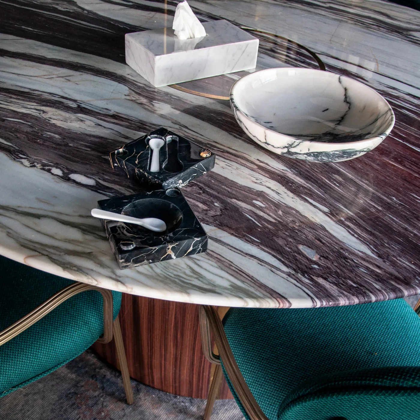Un modo sofisticato per avere la comodità di una scatola di fazzoletti in qualsiasi punto della casa. Questo copri scatola in marmo bianco si adatta a una scatola di fazzoletti standard, creando un accento elegante in uno studio, una camera da letto, un bagno o un soggiorno. Una fessura nella parte superiore consente di accedere facilmente ai fazzoletti, un foglio dopo l’altro. Questo pezzo pesa 1,6 kg e può essere abbinato ad altri pezzi della Collezione Fiammetta V in marmo bianco per un look coeso.