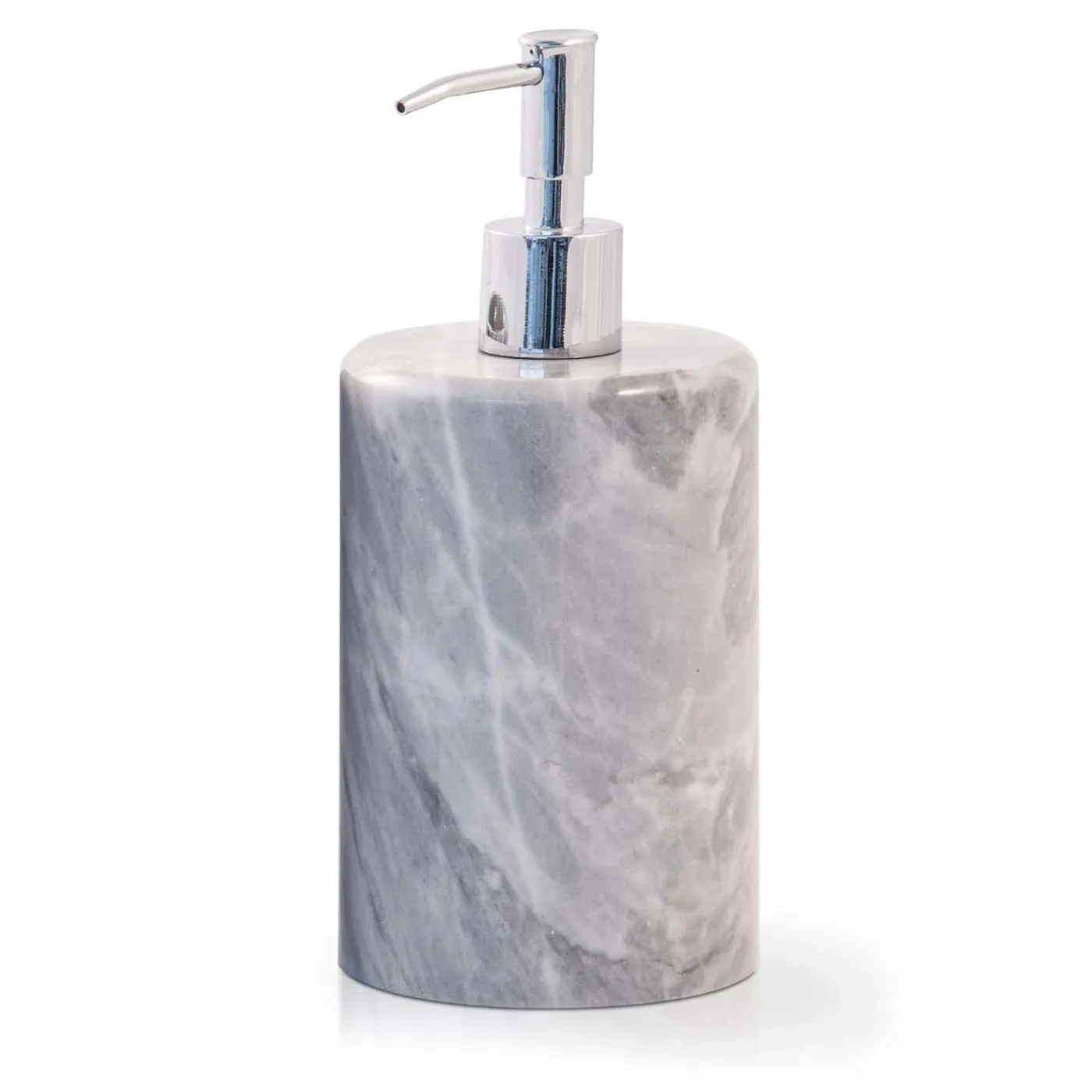 Ideale per una casa sofisticata con un arredamento industriale o contemporaneo, questo set è un prezioso complemento per il bagno, dove può essere abbinato ad altri articoli di Fiammetta V, creando un look coeso. Il set è stato realizzato interamente in marmo grigio e comprende: un portasapone (10 cm di diametro e 2 cm di altezza), un portaspazzolino (7 cm di diametro e 12 cm di altezza) e un dispenser di sapone con pompa in metallo (9 cm di diametro e 19,5 cm di altezza).