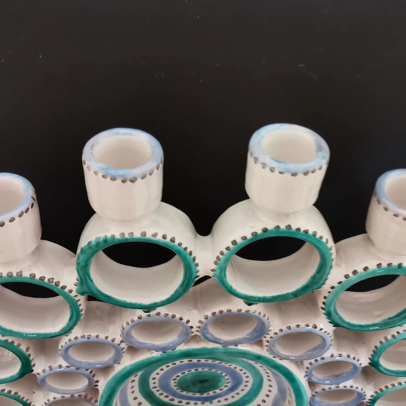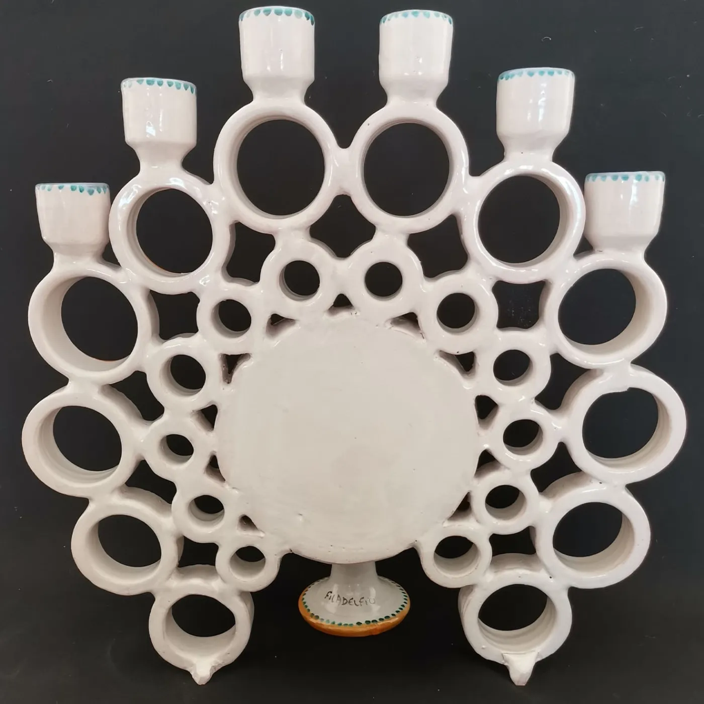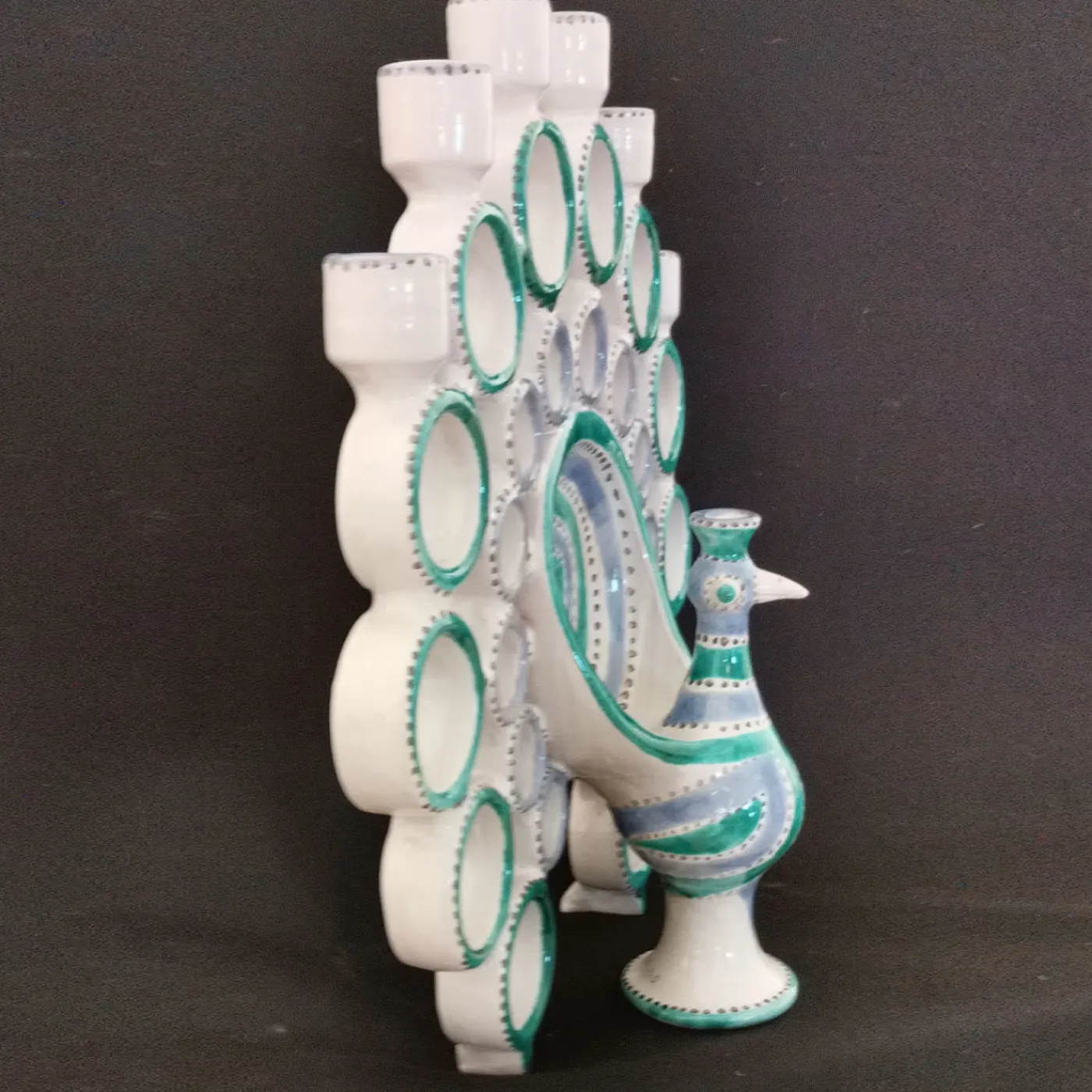 Eccentrico e colorato, questo candelabro in ceramica colpisce per la sua silhouette che ricrea giocosamente un pavone a coda aperta. Un sapiente processo artigianale che va dalla tornitura alla decorazione garantisce l’assoluta unicità di ogni singolo pezzo, che ipnotizza con i suoi anelli torniti disposti a raggiera e impreziositi da vibranti tratti turchesi e azzurri.