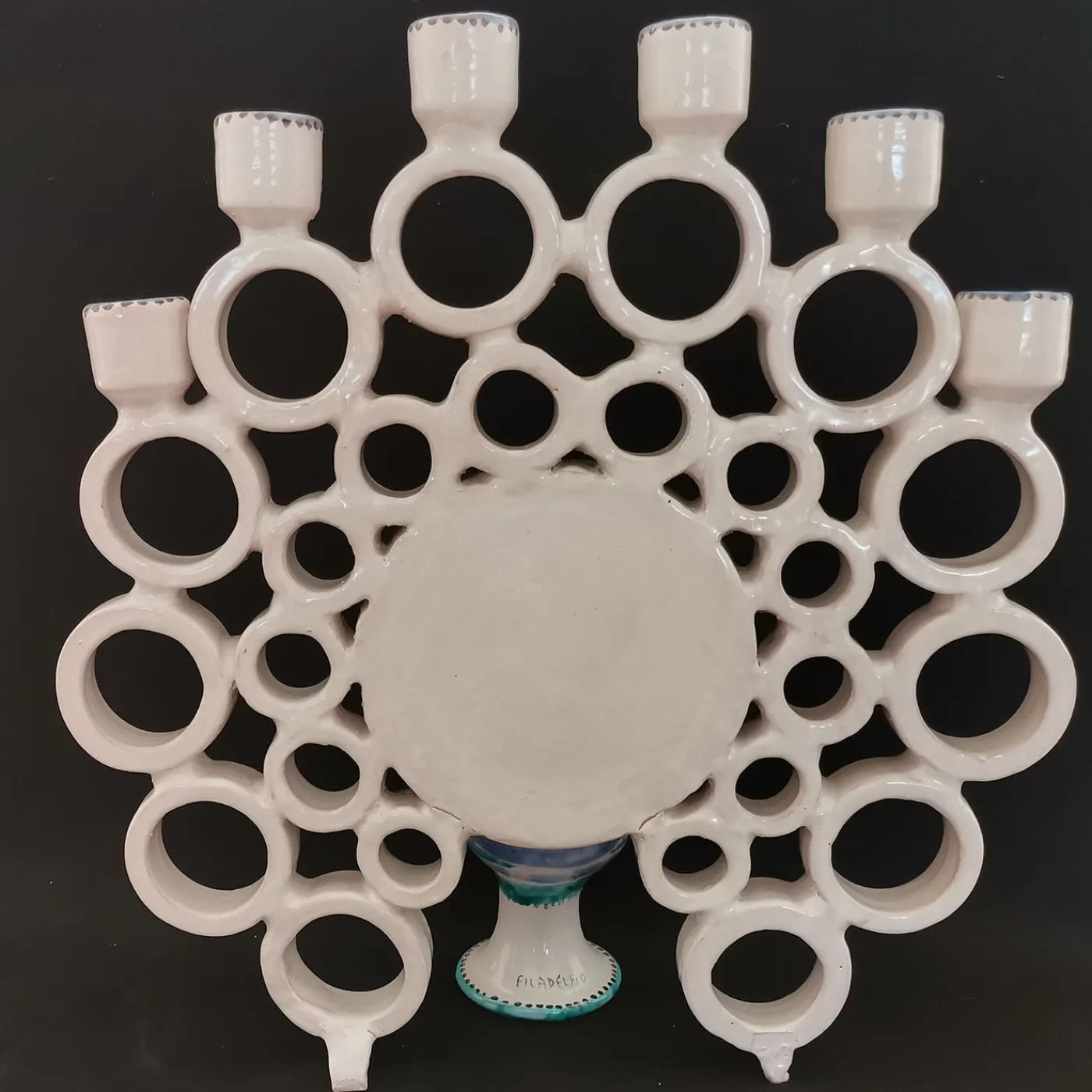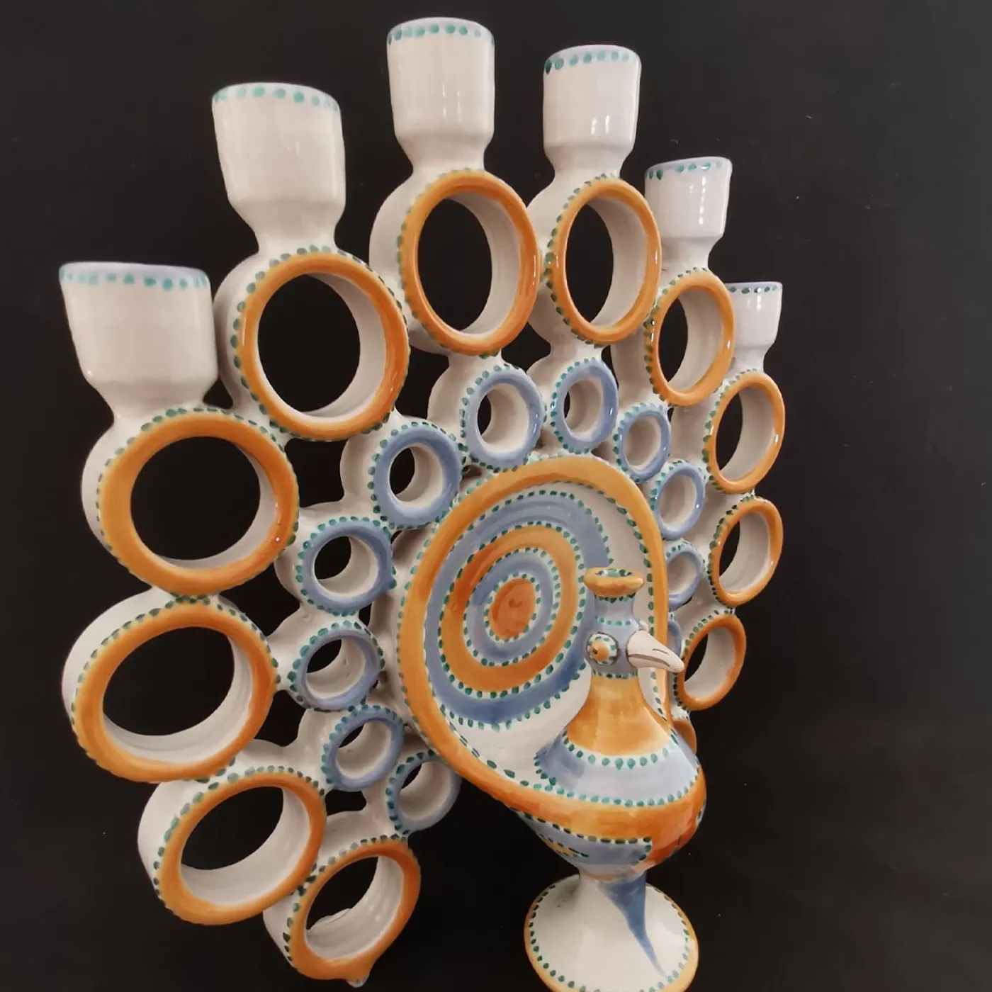 Con sei fessure in cui sistemare altrettante candele, questo candelabro in ceramica è un vero spettacolo con il suo spettacolare design a forma di pavone. Le vivaci tonalità dell’azzurro e dell’arancio ne esaltano l’ispirazione e la lavorazione, che si può ammirare nel trionfo di anelli disposti a raggiera che ricreano ad arte la coda aperta del pavone. Altre opzioni di colore sono disponibili nel catalogo Artemest.