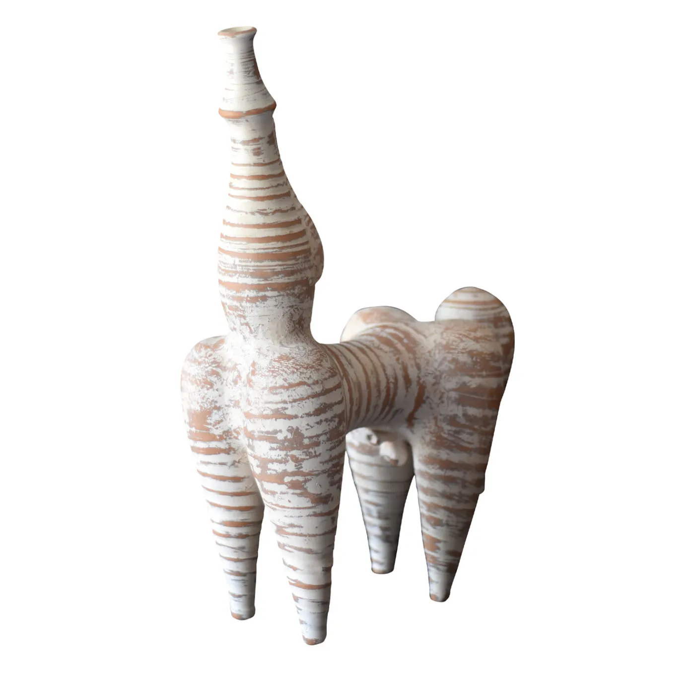Questa elegante scultura in terracotta evoca nelle sue proporzioni e nella sua posizione feroce un cavallo. L’ispirazione zoomorfa è celebrata attraverso l’intrigante equilibrio di volumi rotondi ed elementi affilati e taglienti che trasmettono un senso di forza e armonia. La sua caratteristica texture è ottenuta con la tecnica dell'”ingobbio”, in cui più strati di argilla liquida vengono versati sulla terracotta prima di essere cotti.