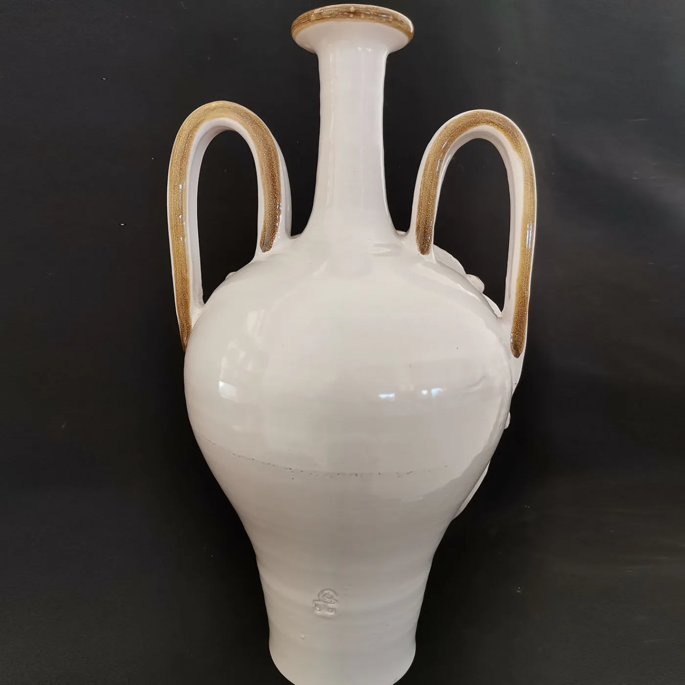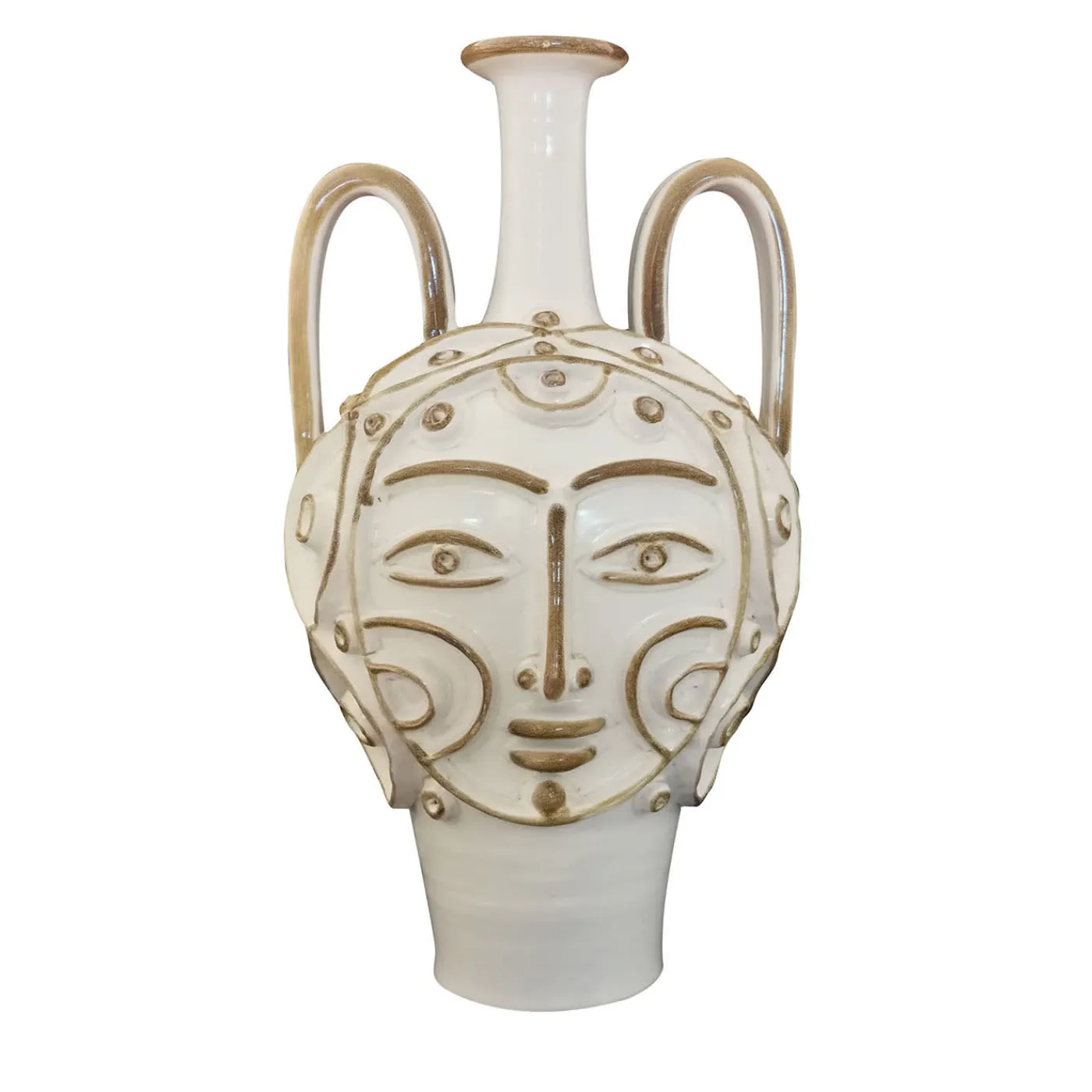Pezzo irripetibile, pazientemente tornito, modellato e decorato a mano, questo vaso ad anfora seduce con i suoi tratti antropomorfi tracciati con linee nette. Gli ornamenti ad alto rilievo massimizzano l’impatto decorativo del pezzo, che risulta controbilanciato da un tranquillo smalto bianco con dettagli tracciati in un’elegante tonalità marrone tenue. Manici drammaticamente curvi e un collo lungo e stretto sigillano il design.