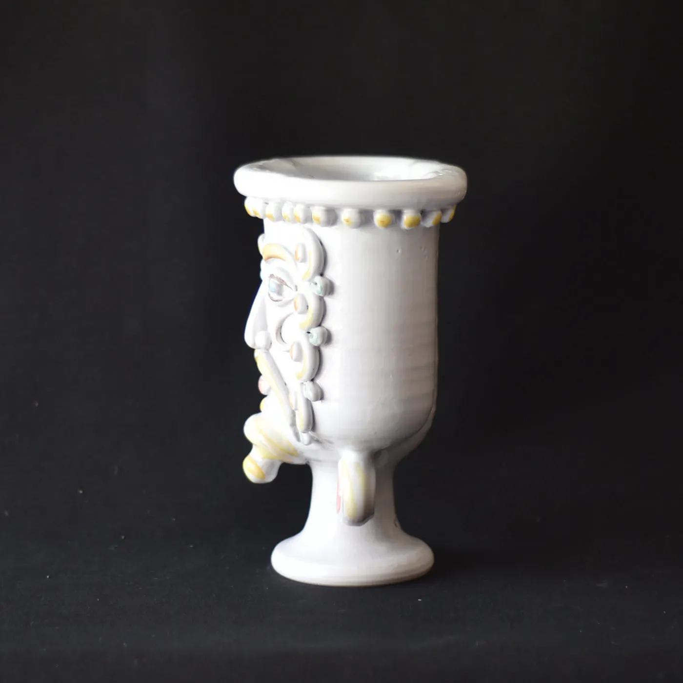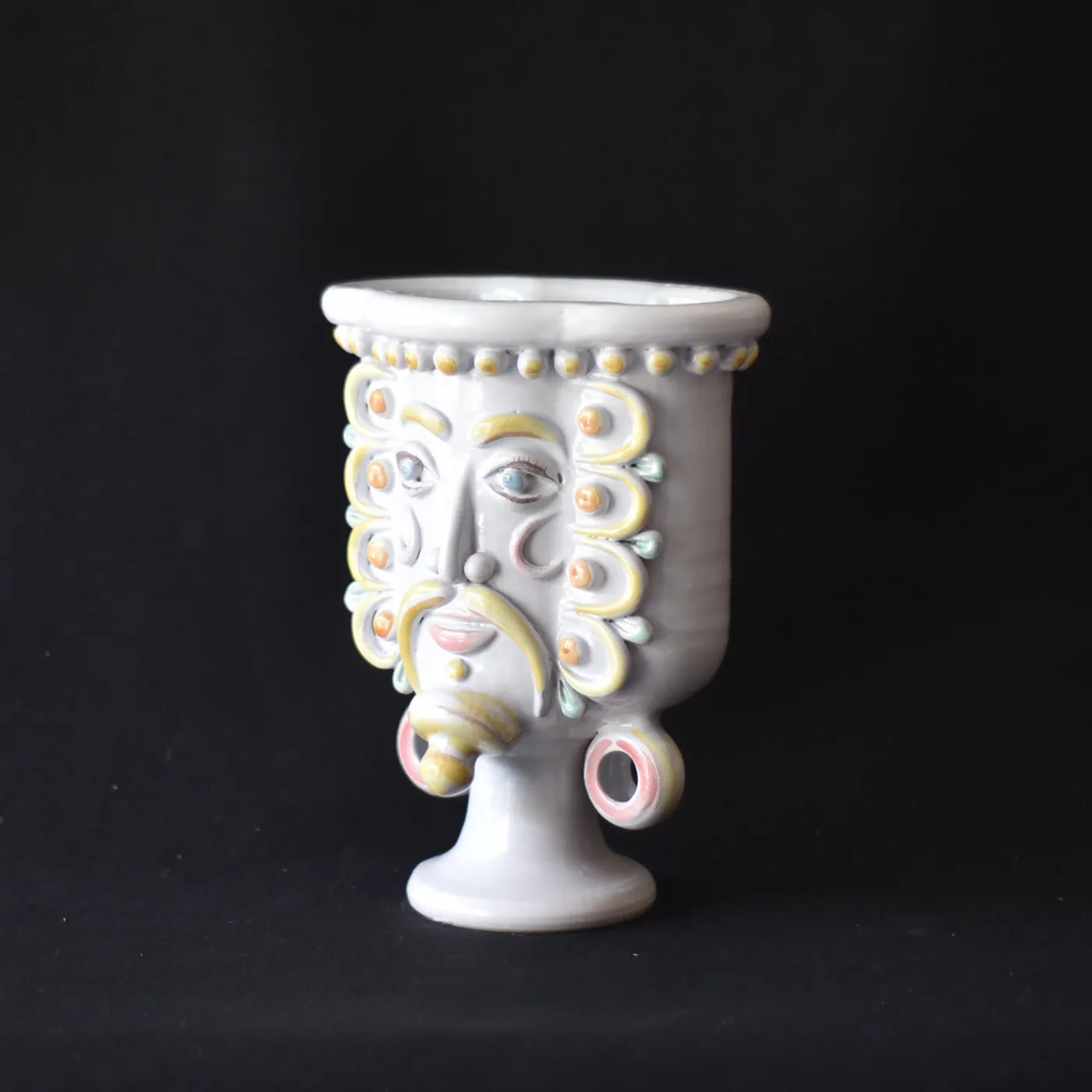 Raffigurante il cavaliere saraceno che sposò la bella Angelica nel poema epico “Orlando Furioso”, questo squisito vaso in terracotta smaltata eleverà qualsiasi superficie con la sua estetica ben rifinita e vivace. Lavorata al tornio e modellata a mano, l’accattivante silhouette comprende un elemento di piedistallo che sostiene la sezione a forma di testa che colpisce per l’acconciatura moresca e i delicati dettagli antropomorfi evidenziati da smalti colorati.
