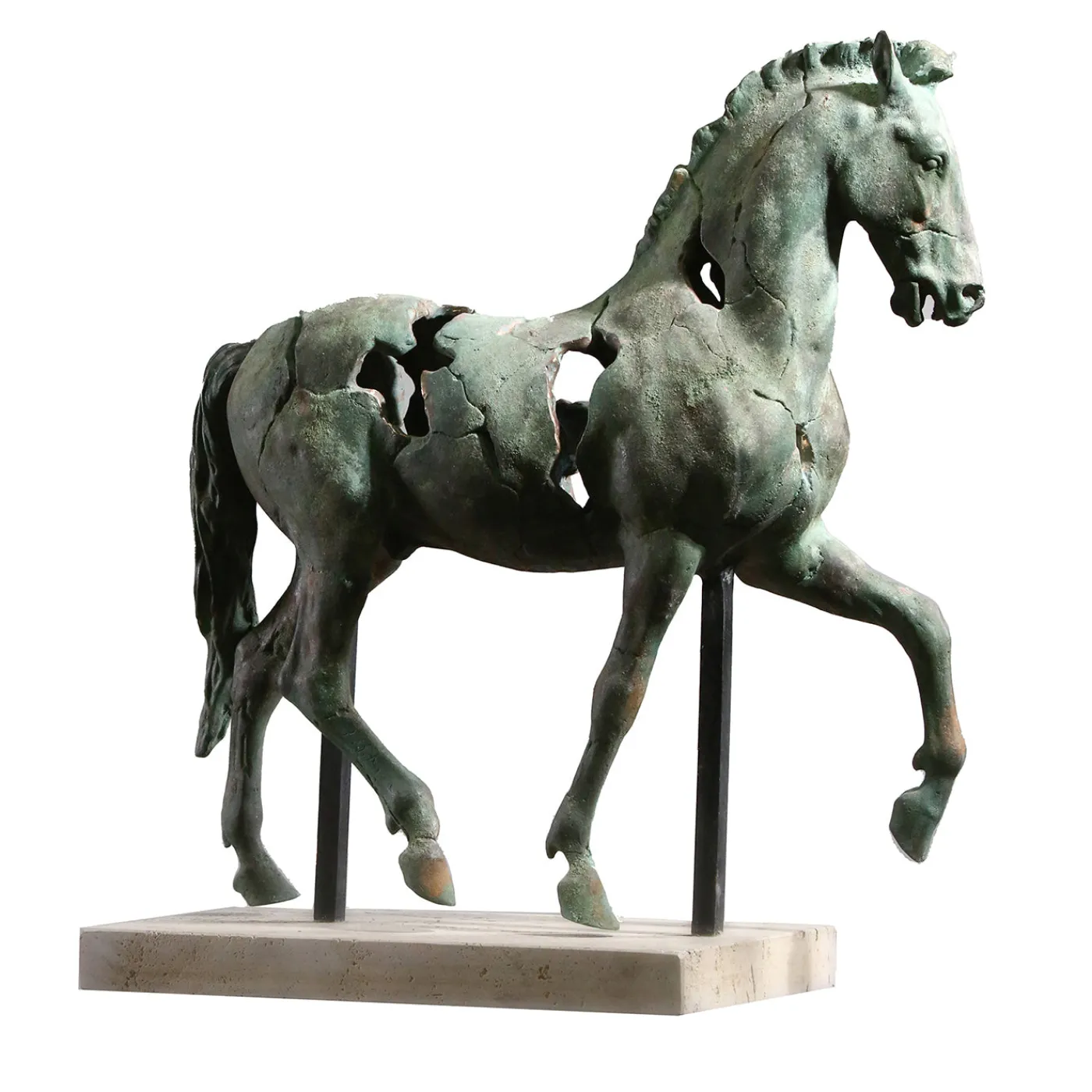 Questa scultura in bronzo presenta una dinamica forma equestre realizzata tramite la tecnica della fusione a cera persa. È rifinita con una distintiva patina verde applicata a fuoco che ne esalta l’aspetto invecchiato e frammentato. Collocato su una robusta base in travertino romano, questo elemento decorativo si presenta come un eccezionale esempio di arte scultorea ispirata all’antichità classica.