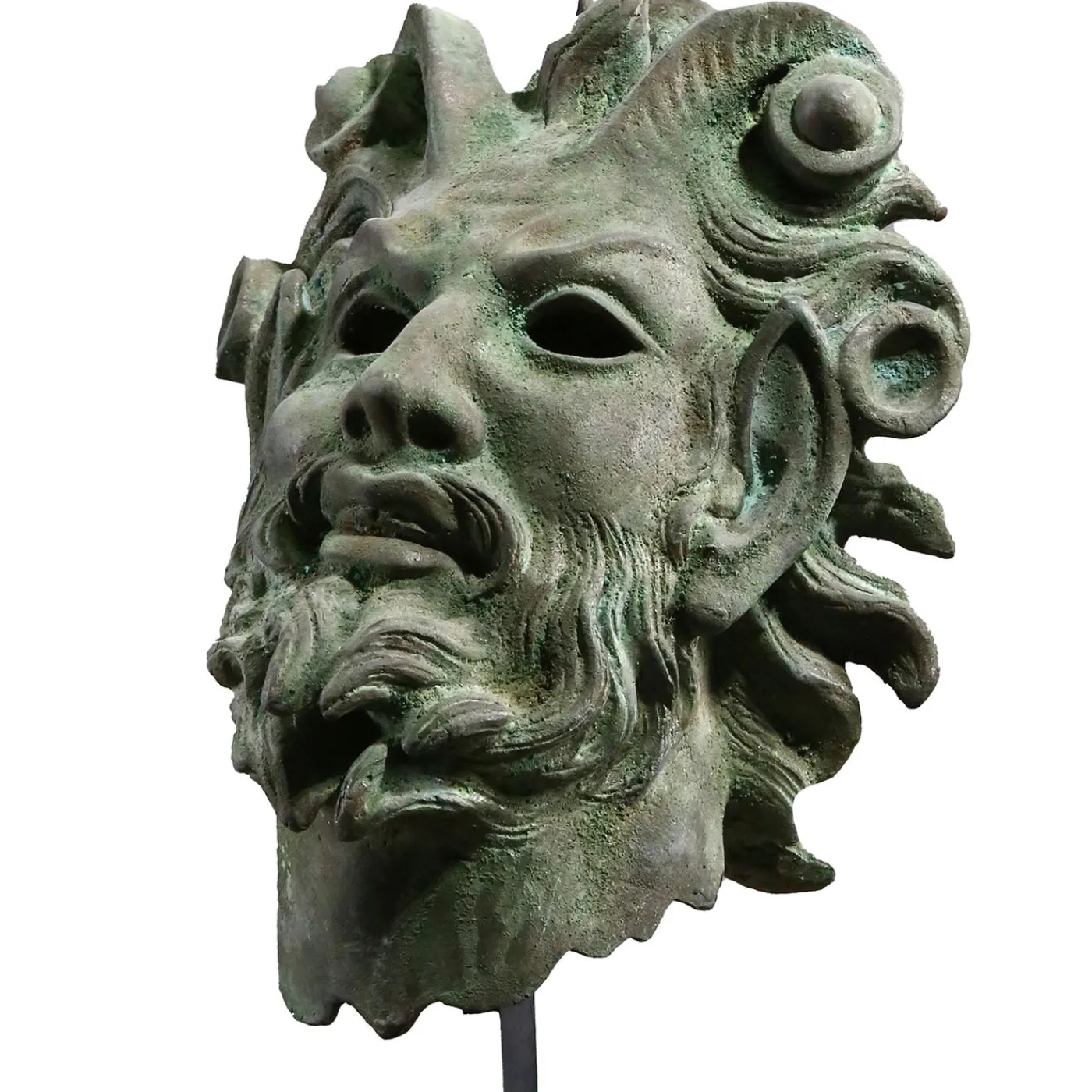 Questo squisito pezzo rappresenta la testa di un fauno barbuto, chiaramente raffigurato con le sue corna di capra e le orecchie allungate. Il fauno era l’equivalente romano dell’antico satiro greco, una creatura mitologica per metà umana e per metà caprina, manifestazione degli spiriti della foresta e degli animali che aiutavano o ostacolavano gli uomini a seconda dei loro capricci. L’uso del bronzo con la tecnica della fusione a cera persa e una patina verde che poggia su un piedistallo di marmo, aggiunge un tocco di fascino classico a qualsiasi arredamento.