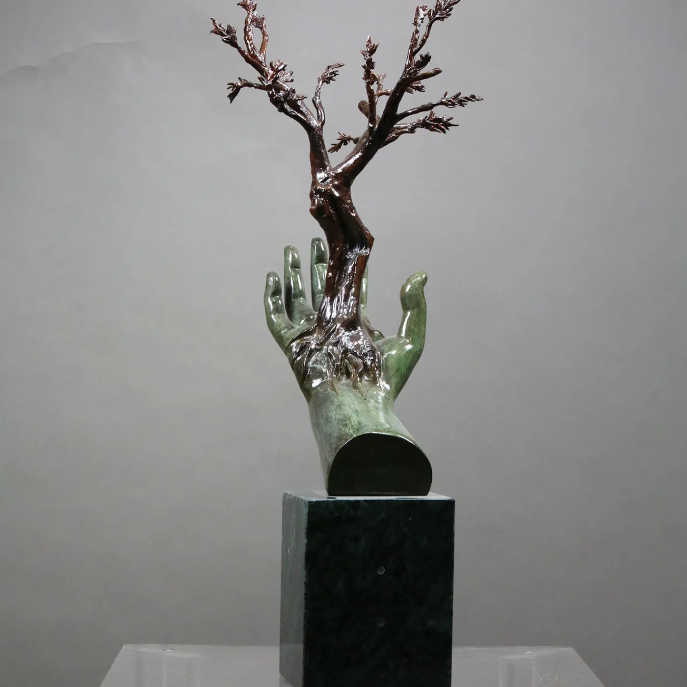 Questa affascinante scultura raffigura una mano che si trasforma in un albero, realizzata con la tecnica della fusione a cera persa con finitura verde. Si erge su una base di marmo verde, nero o bianco, che ne accresce il fascino artistico. L’opera simboleggia la crescita e il legame con la natura e rappresenta un’aggiunta significativa a qualsiasi spazio.