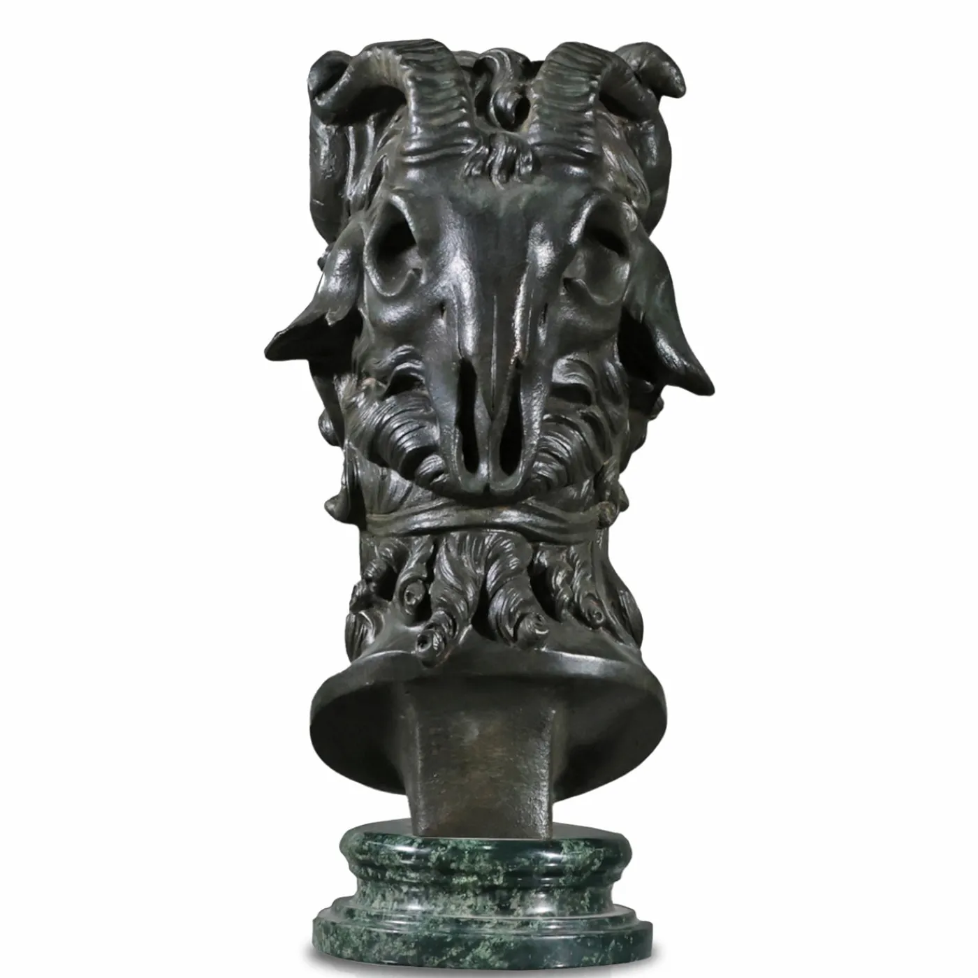 Questa scultura in bronzo raffigura una testa di bucranio, realizzata con la tecnica della fusione a cera persa che garantisce dettagli raffinati e durata nel tempo. Rifinita con una patina scura applicata a fuoco, poggia su una solida base in marmo che ne assicura stabilità ed eleganza. L’opera rappresenta un elemento decorativo di grande impatto, adatto a diversi stili d’arredo, unendo ispirazione classica a un’artigianalità raffinata.