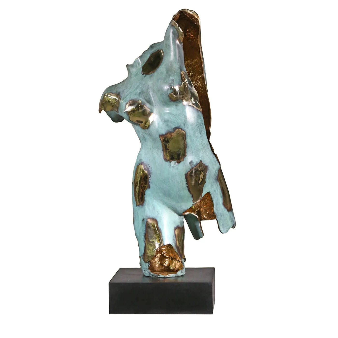 Questa scultura decorativa presenta una forma dinamica creata attraverso la tecnica della fusione a cera persa, mostrando una patina distintiva di verde con dettagli di pennellate trattate al fuoco. Montata su una base di bronzo, questa scultura offre un colpo d’occhio sorprendente di superfici testurizzate e riflessi di bronzo lucido. Progettata per servire come un elemento decorativo affascinante, incarna una fusione di ispirazione classica e arte contemporanea.