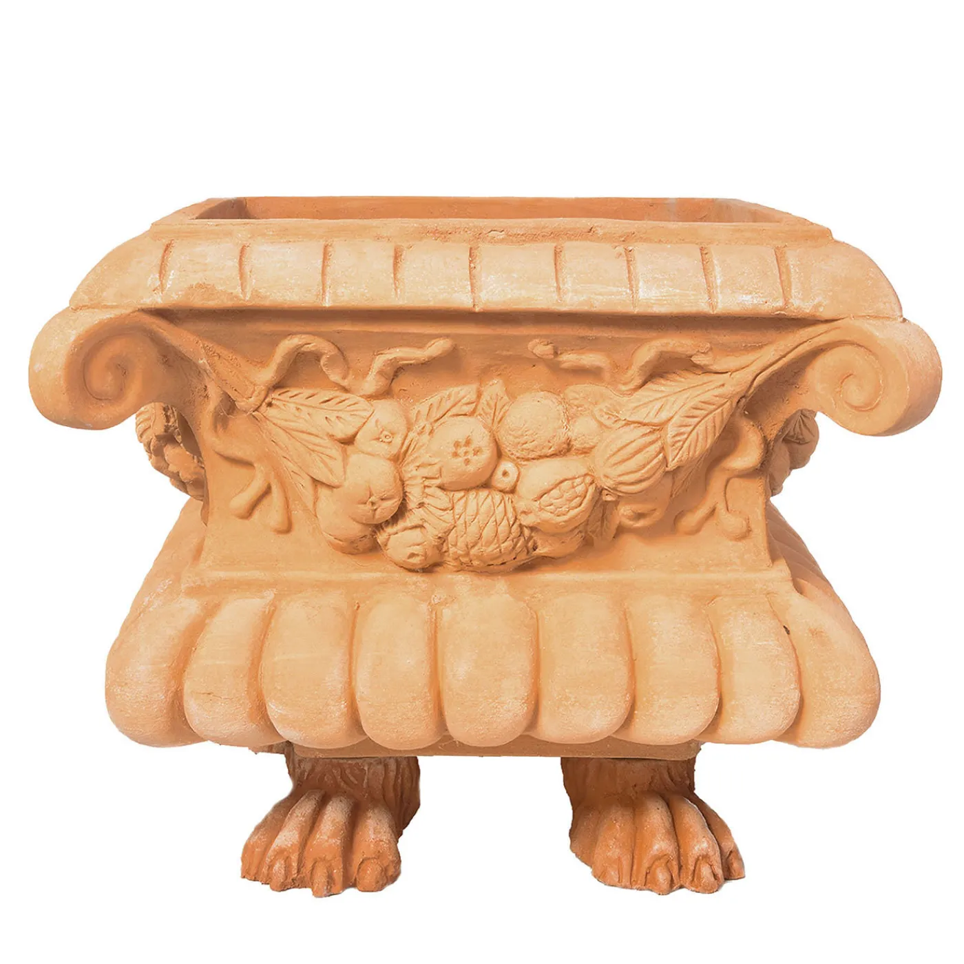 Questa fioriera artistica esemplifica l’impareggiabile qualità della terracotta artigianale del distretto ceramico dell’Impruneta, vicino a Firenze. Una ghirlanda tridimensionale a forma di natura morta orna i lati, insieme a volute e volumi incanalati. Il vaso è sollevato da due piedi a forma di zampe di leone, per un dettaglio eccentrico che darà carattere a qualsiasi terrazza o patio. Certificato CAT.