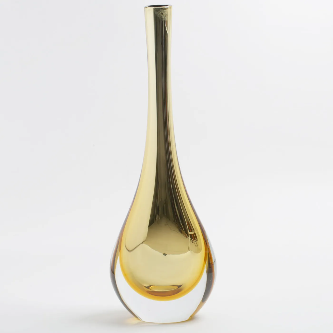 Questo squisito vaso a forma di lacrima è di colore ambrato, immerso nel cristallo. La finitura a specchio freddo crea il suggestivo effetto dell’oro lucido.