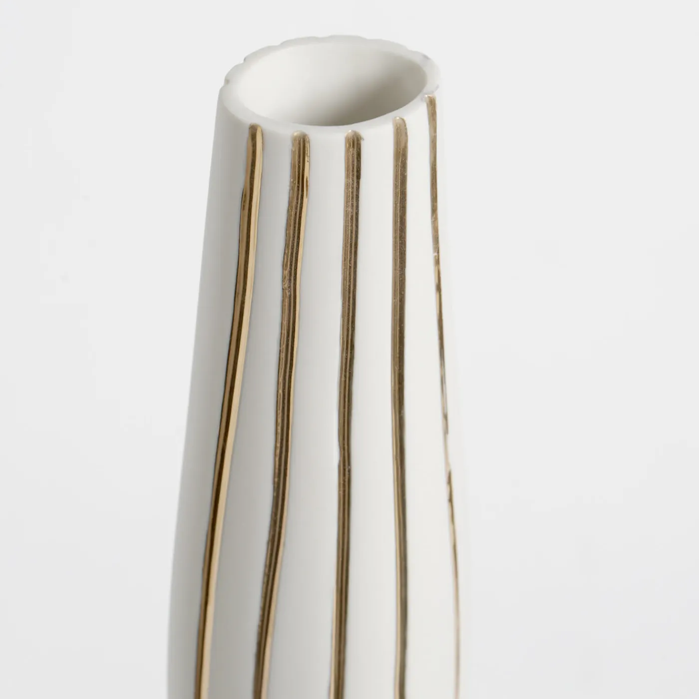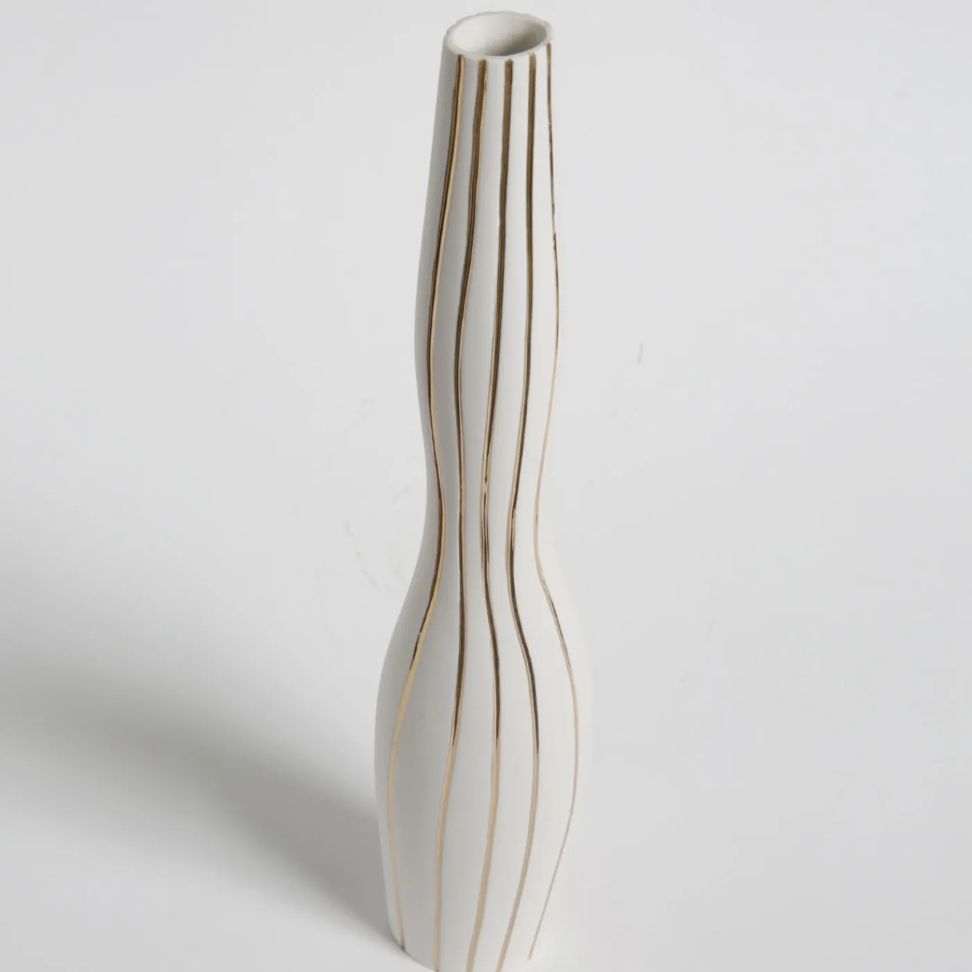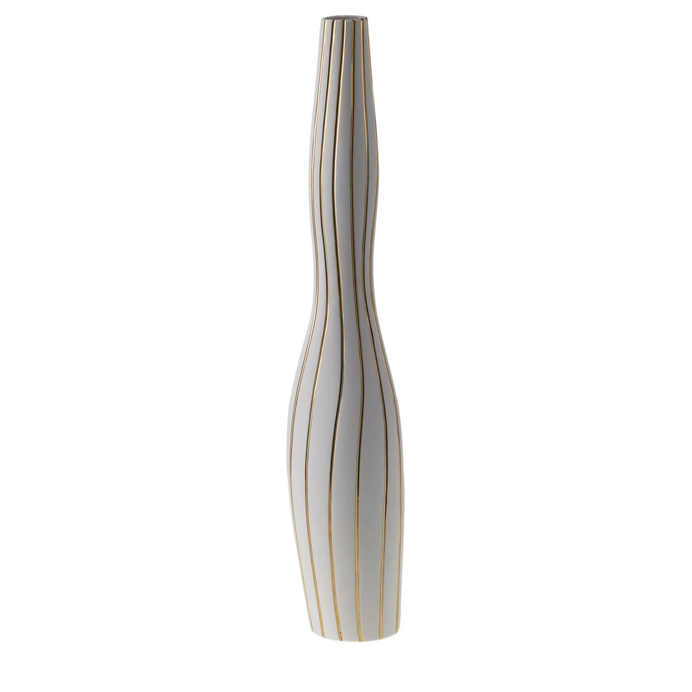 In questa raffinata bottiglia di porcellana, il design minimalista, ispirato alle figurine antropomorfe, è in porcellana non smaltata, o “biscotto”, arricchito da preziosi dettagli in oro 23k applicati a mano che corrono verticalmente lungo l’esterno del vaso e lo rendono un sorprendente oggetto d’arte.