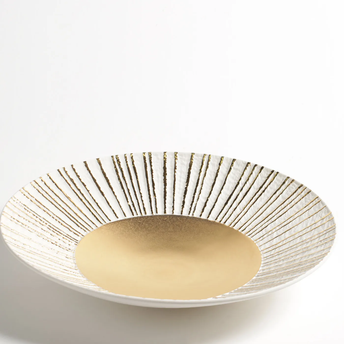 In questo squisito centrotavola in porcellana, l’elegante design è arricchito dalla presenza di un prezioso strato centrale di oro 23k applicato a mano che illumina la parte inferiore del pezzo e corre verticalmente in linee parallele verso il bordo, rendendo questo pezzo un sorprendente oggetto d’arte.