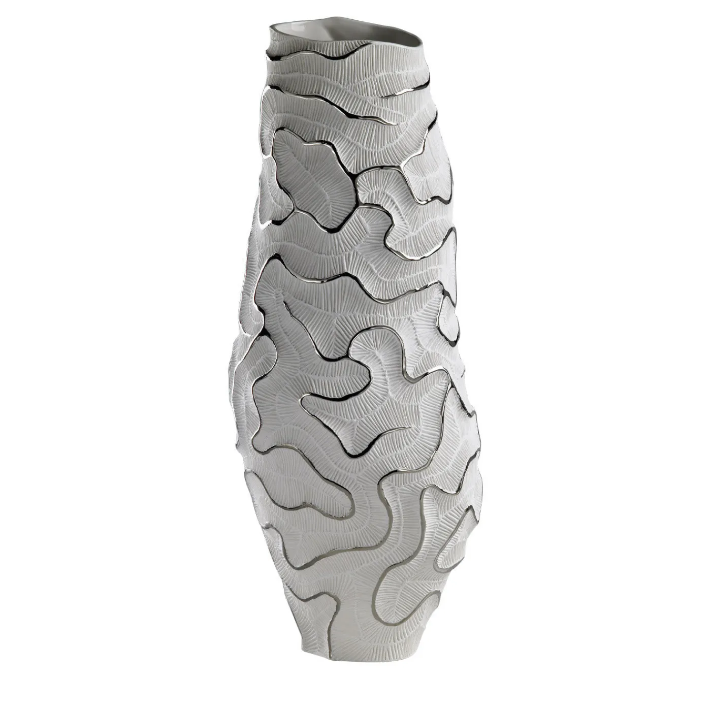 Una trama fitta e intricata, che rimanda ai fossili di madrepore, fa da scheletro a questo vaso della collezione Fossilia. Caratterizzato da una bella composizione, dalla perfezione delle forme e dall’accuratezza dei dettagli della porcellana non smaltata, il vaso è impreziosito dall’uso del platino, applicato a mano e fissato tramite un ulteriore processo di cottura.