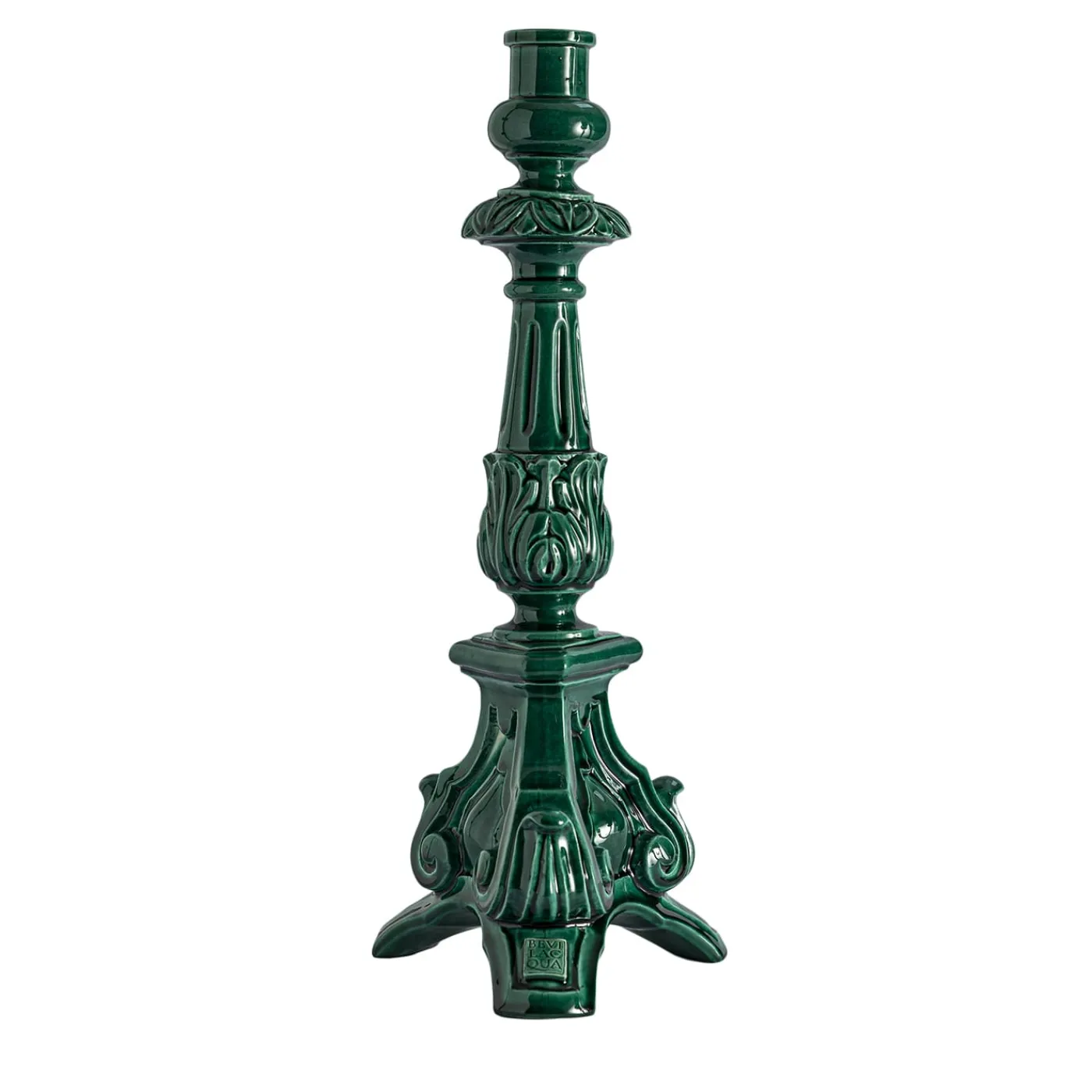 Tra geometrie ardite e curve barocche, questo portacandele in ramina verde diventa una scultura luminosa, che danza nelle tonalità della notte siciliana. Più che una semplice fonte di luce, è una promessa di serate avvolte nella magia dell’isola, dove la luce si trasforma in arte e la ceramica in un’elegante celebrazione di una bellezza senza tempo.