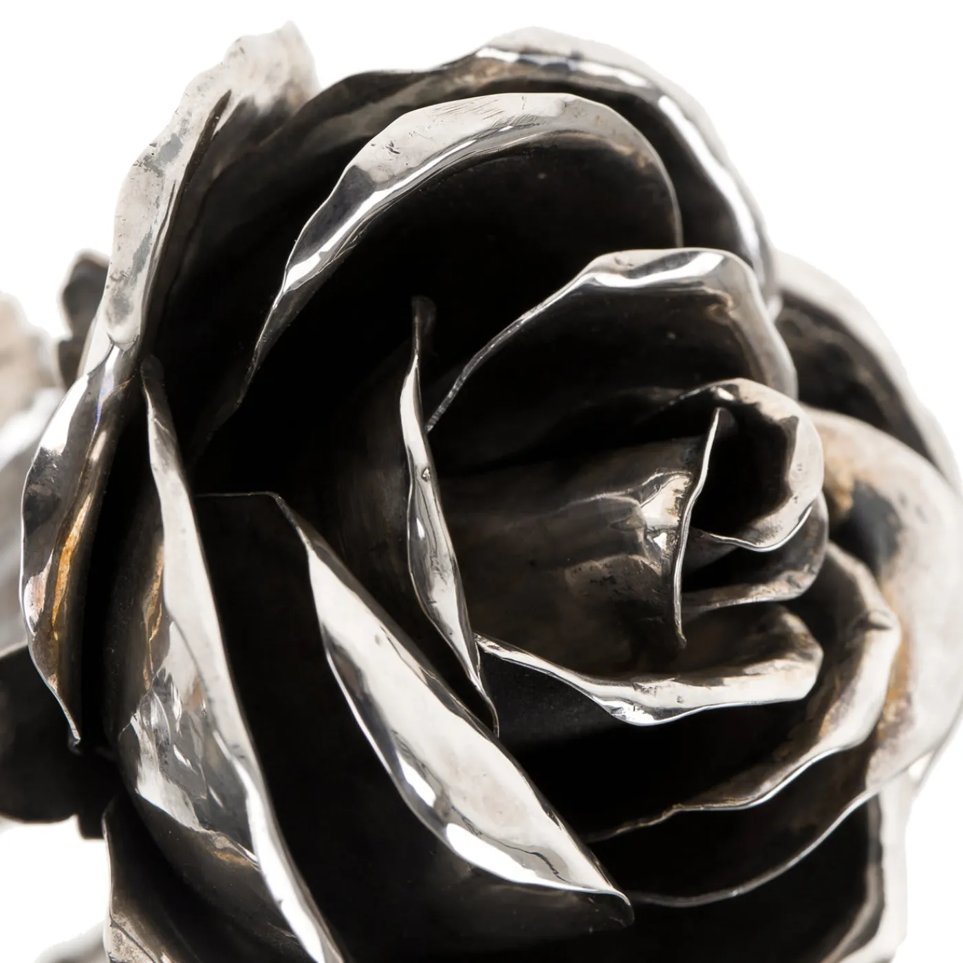 Simbolica e ornamentale al tempo stesso, l’abile lavorazione della bottega argentiera fiorentina Fratelli Lisi raggiunge una somiglianza con la vita in questa elegante rosa in argento sterling. Il fiore è sbalzato e inciso a mano per ottenere il massimo grado di dettaglio.