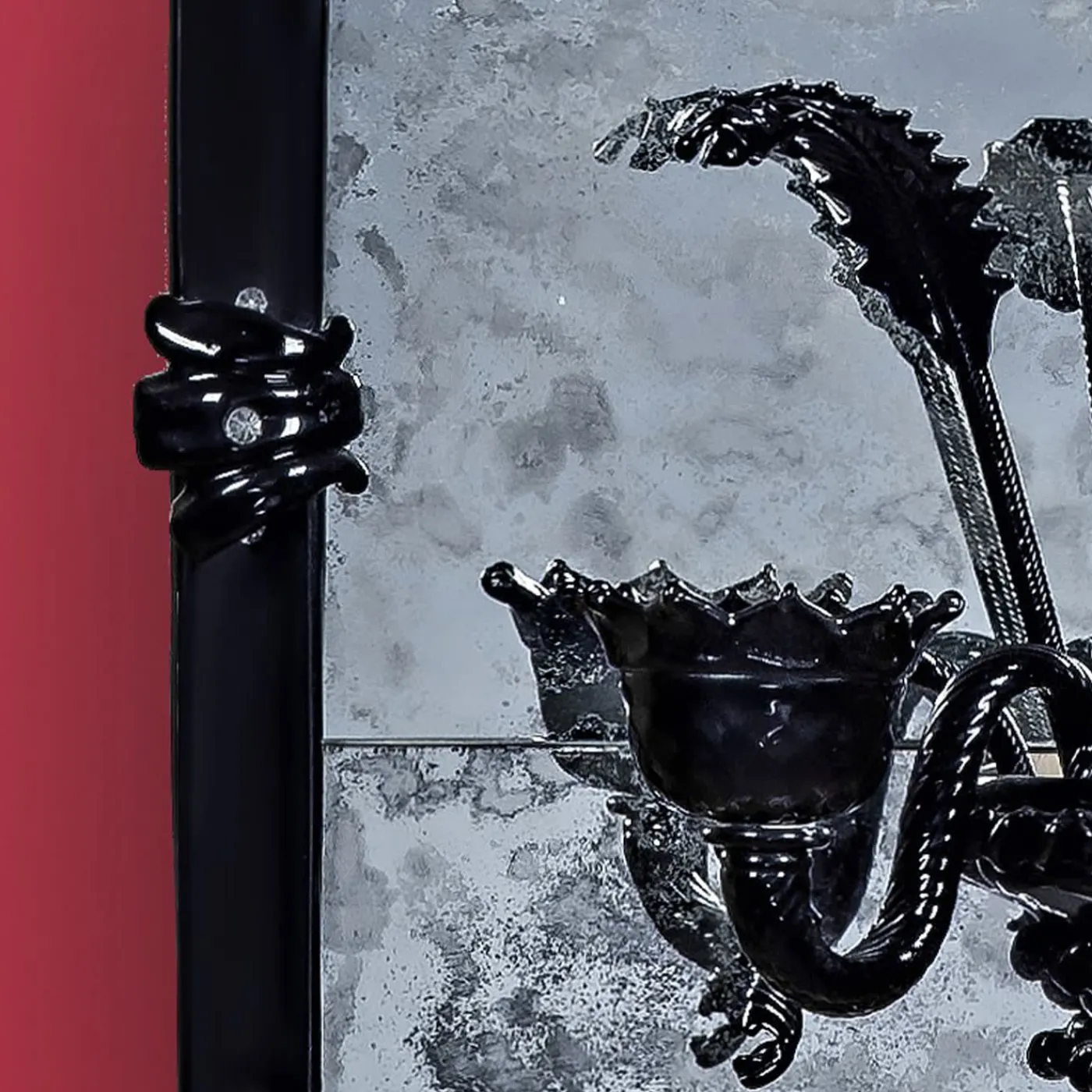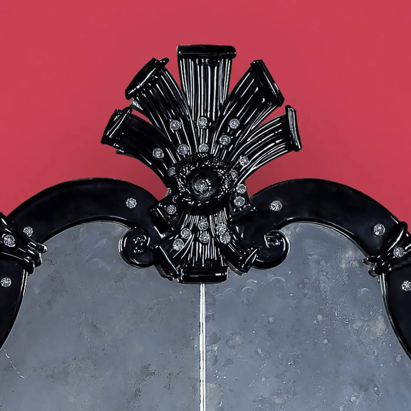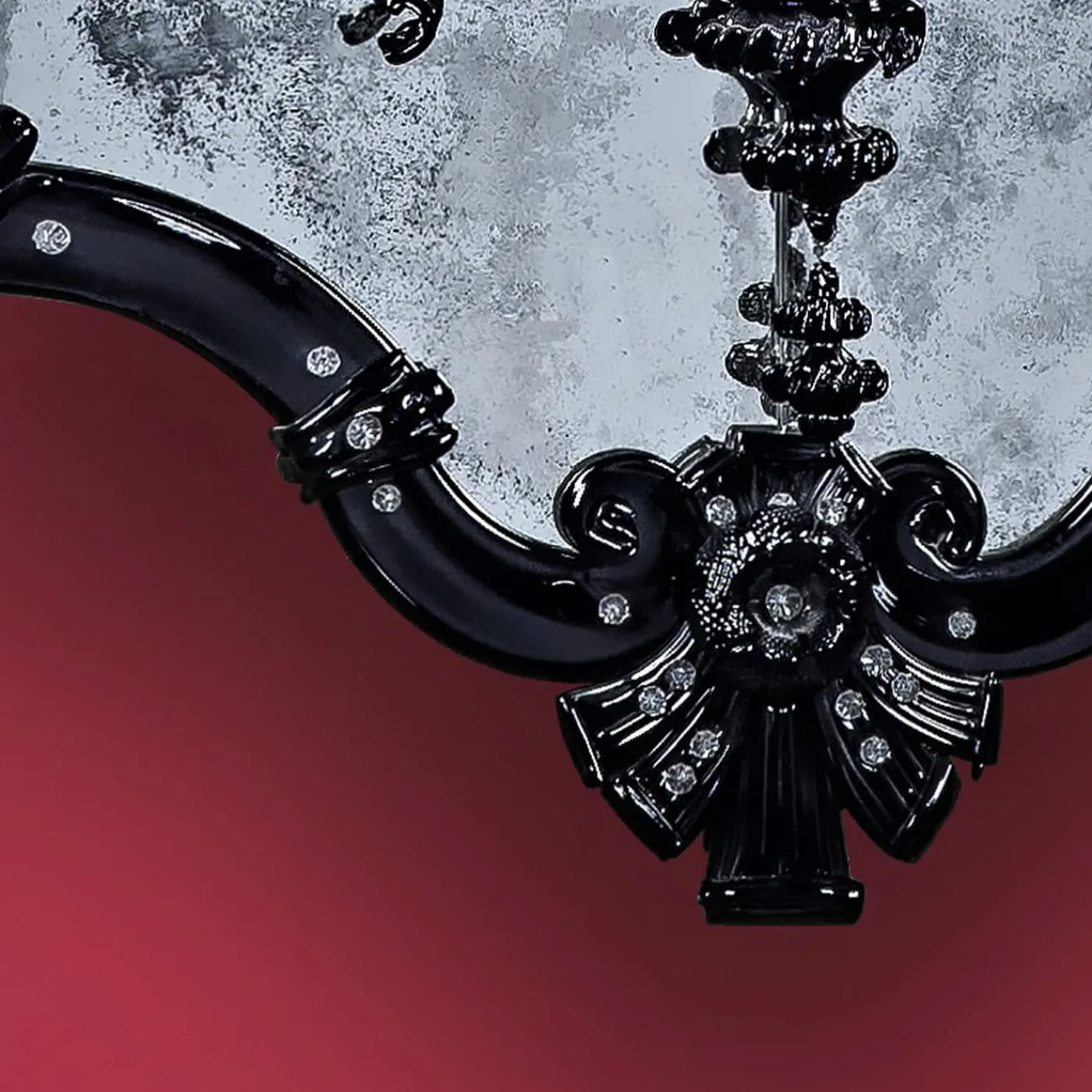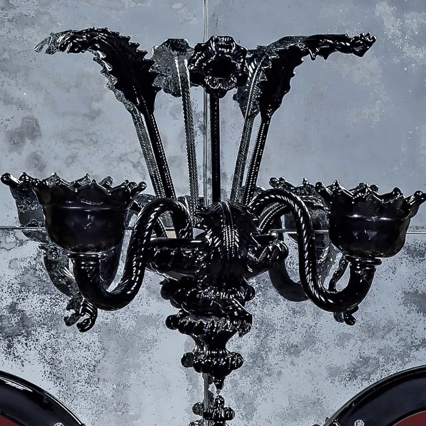 Specchio cangiante in vetro di Murano con l’inserimento di un’applique a due luci nello specchio centrale in tipico stile veneziano. L’applique nera, eseguita secondo le antiche tecniche dei nostri maestri vetrai che si sono tramandate fino ai giorni nostri, genera un’opera unica nel suo genere, con doppia funzione, illuminando le nostre case con uno specchio in totale stile veneziano, prodotto da Fratelli Tosi su Design by Fratelli Barbini Glass Mirror. Lo specchio, composto da una cornice nera in vetro di Murano, viene argentato e anticato con argento puro, per poi essere rifinito con foglie e fiori neri.