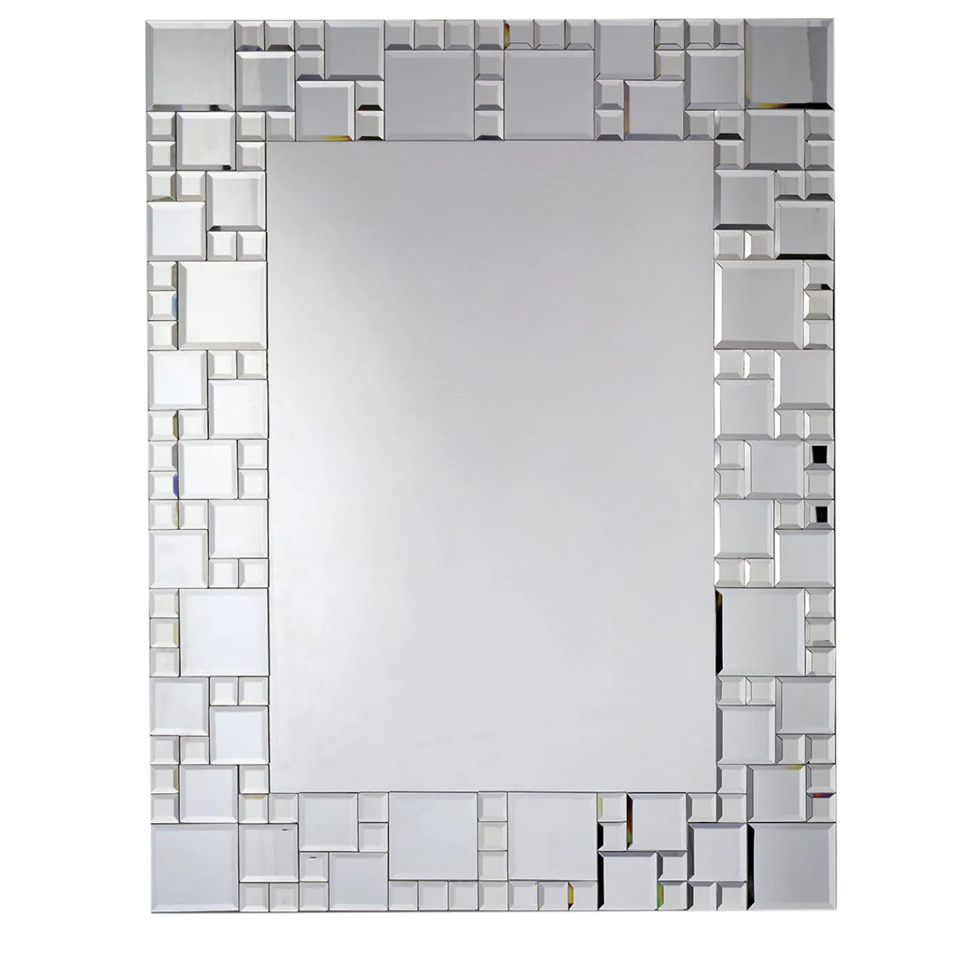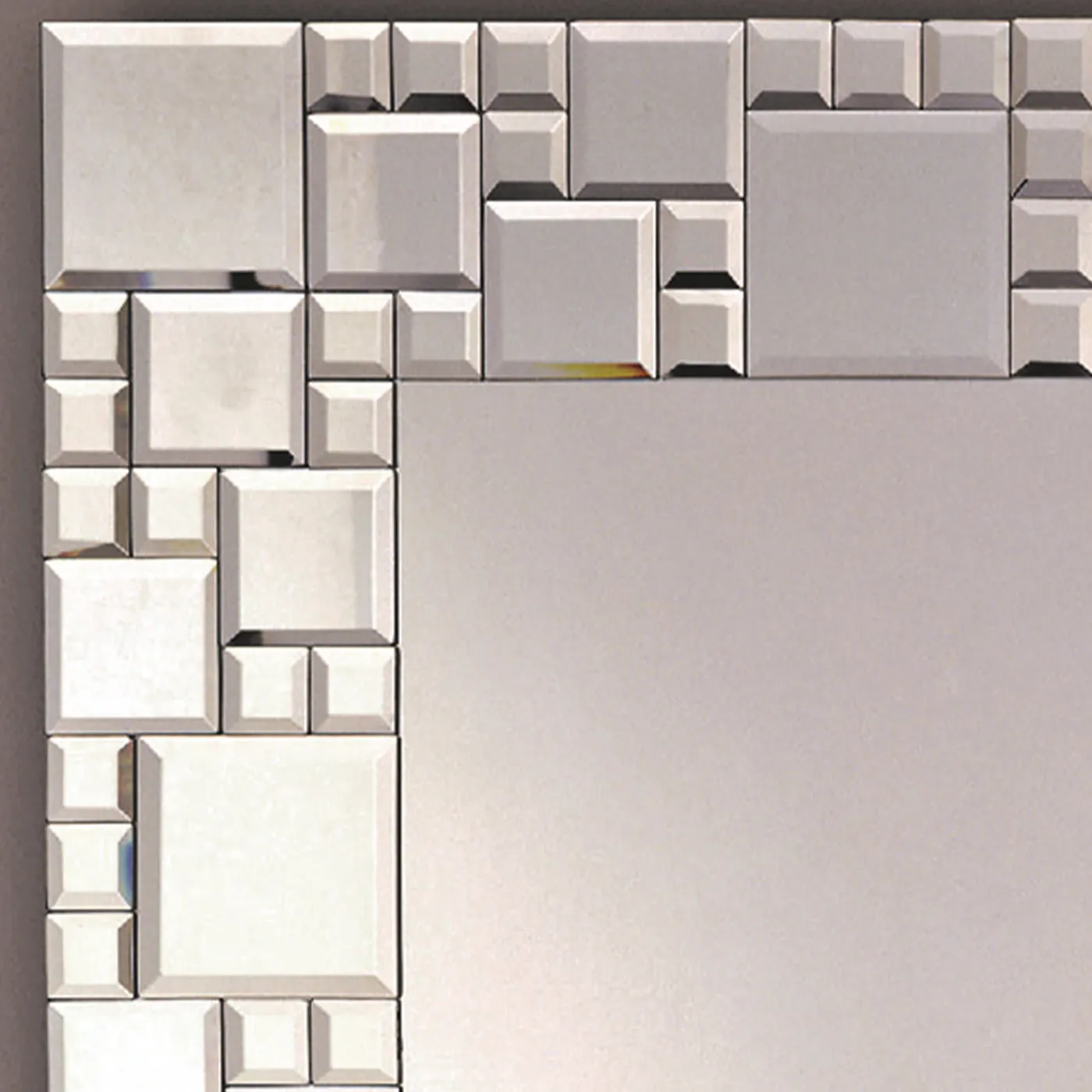 Questo specchio rettangolare è una vetrina di impareggiabile artigianalità realizzata dai maestri vetrai di Murano secondo le tecniche tradizionali del XIV secolo. La cornice è ornata da quadrati di vetro di varie dimensioni in vetro di Murano trasparente.