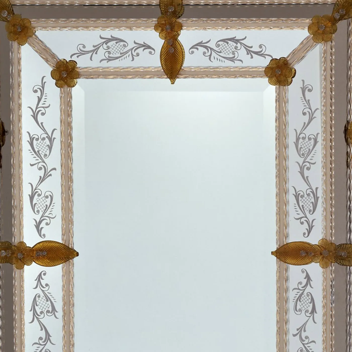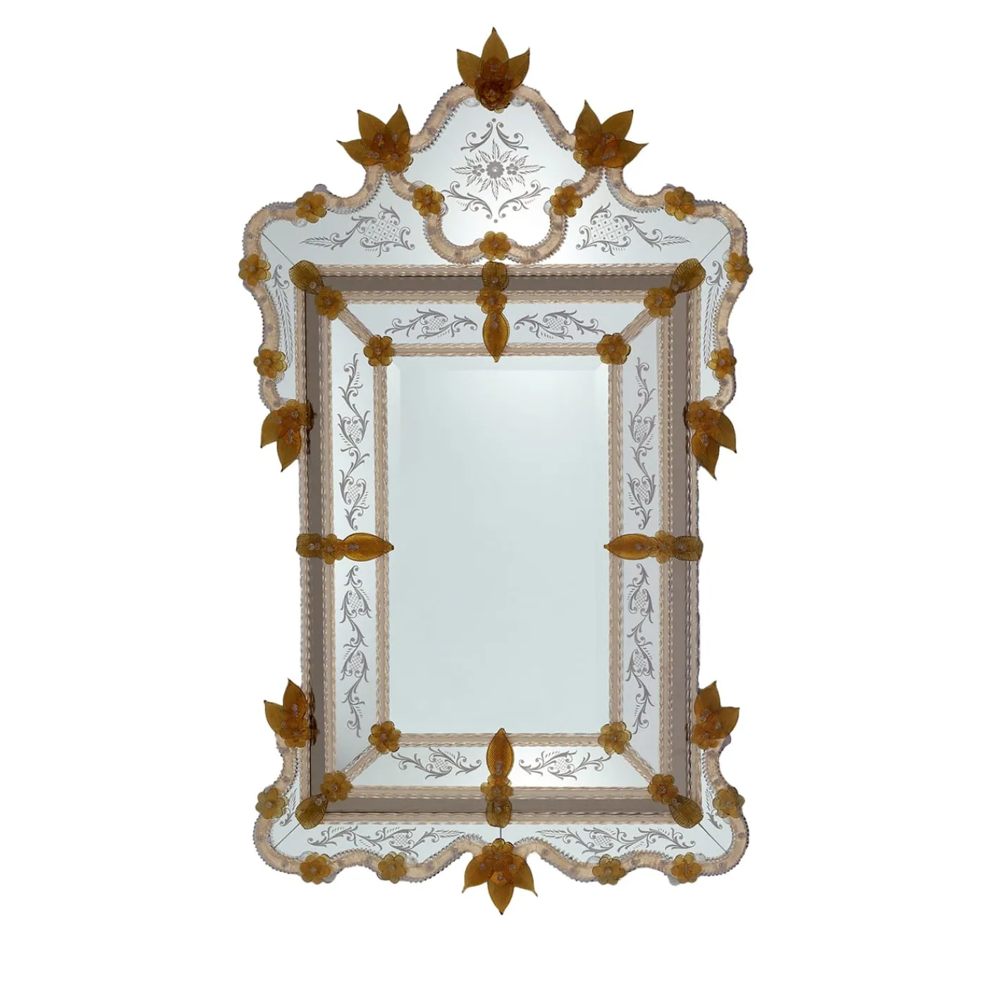 Specchio in vetro di Murano “Toronto” in stile veneziano, realizzato dalle mani esperte dei maestri muranesi. La cornice è composta da bacchette e riccioli di cristallo su fondo oro. Le incisioni che adornano questo lussuoso specchio sono interamente realizzate a mano e le finiture, costituite da rose e foglie di varie dimensioni e di colore “Ambra”, impreziosiscono questo meraviglioso specchio creato nel laboratorio Fratelli Tosi sull’isola di Murano.