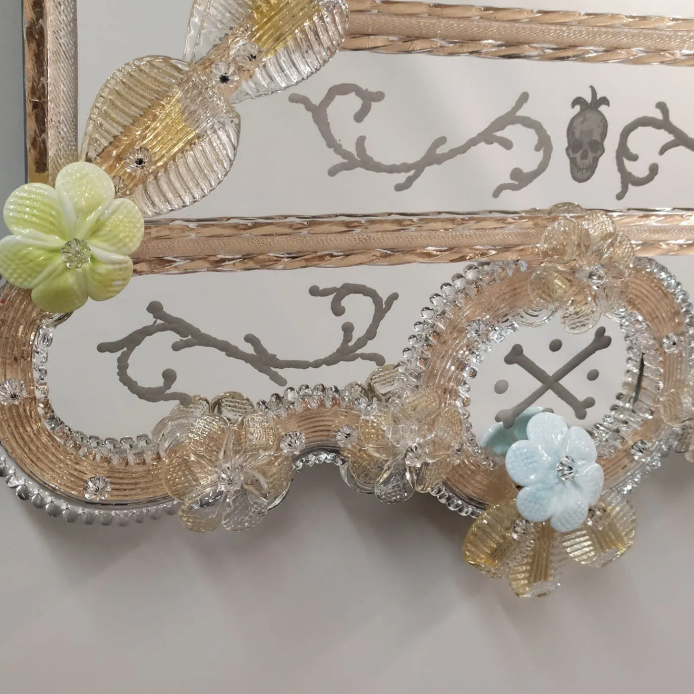 Spring è una reinterpretazione in chiave pop-art di uno specchio tradizionale in vetro di Murano. Caratterizzato dalla tavolozza di colori vivaci dell’infanzia di Bradley Theodore nelle isole caraibiche di Turks & Caicos, Spring presenta i classici rosoni e foglie in vetro soffiato di Murano ed è completamente inciso a mano con i motivi di Theodore come coralli, cavallucci marini, stelle marine, teschi e ossa. Questo specchio è realizzato in edizione limitata di un pezzo.