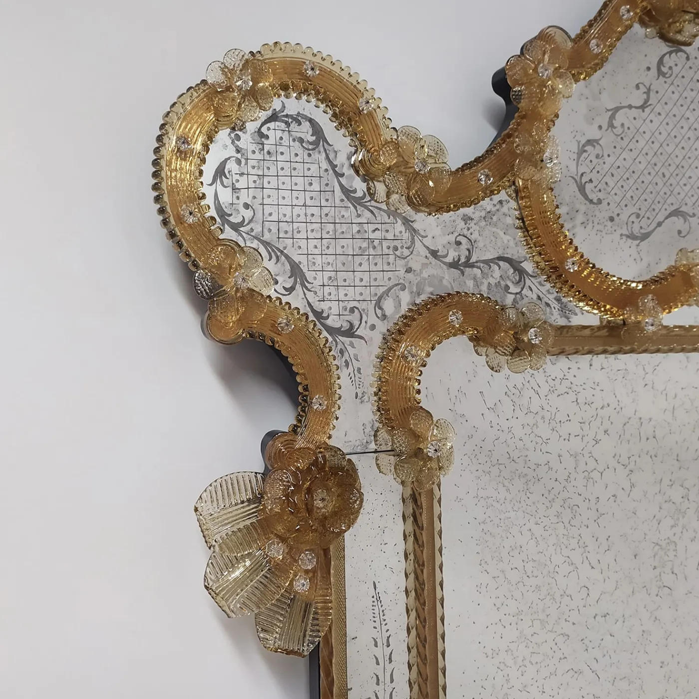 Immerso nella storia, questo specchio in vetro di Murano è un capolavoro di eleganza veneziana. Le intricate incisioni floreali e le calde volute di vetro ambrato riecheggiano il fascino dei paesaggi lagunari di Venezia, mentre i dettagli in argento antico ne esaltano il fascino senza tempo. Realizzato a mano dai Fratelli Tosi, questo specchio è più che un oggetto d’arredo: è un portale verso il passato, che invita a un tocco di grandezza storica in ogni casa, sia che venga collocato all’ingresso sia che si trovi sopra un’antica consolle.