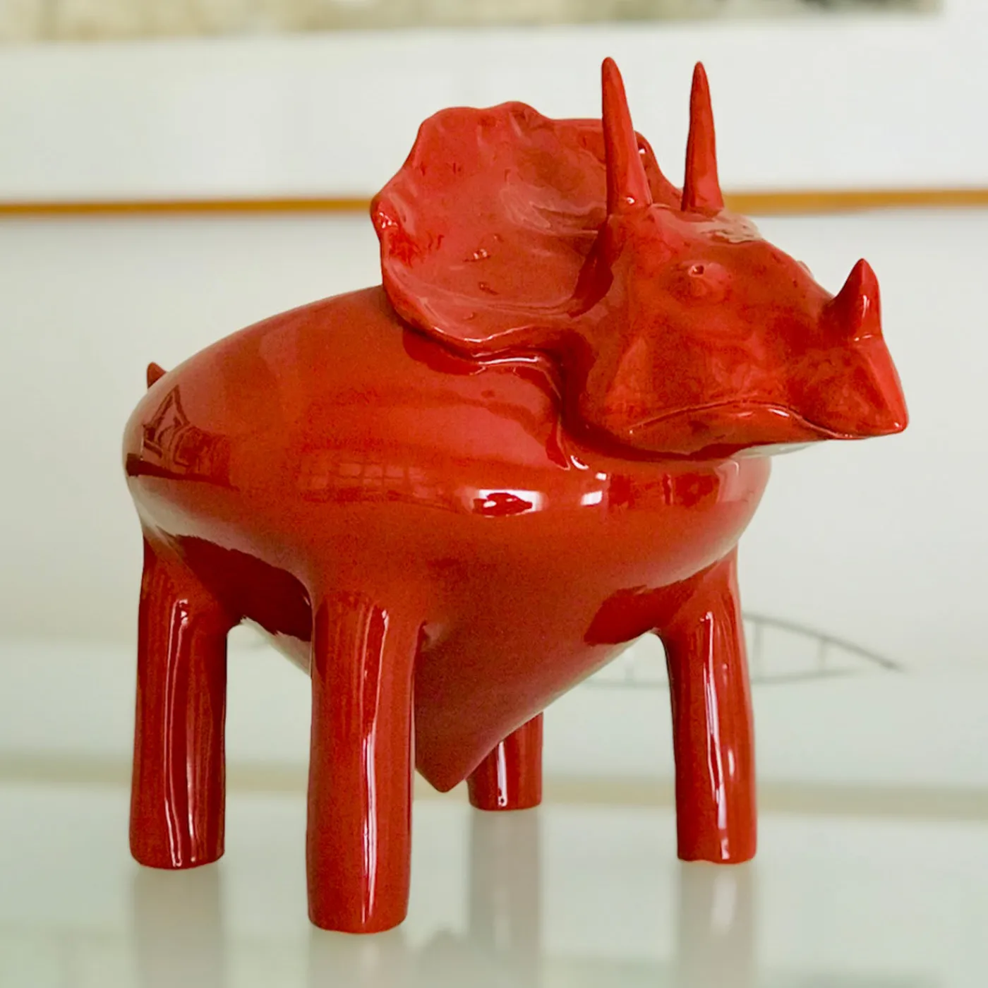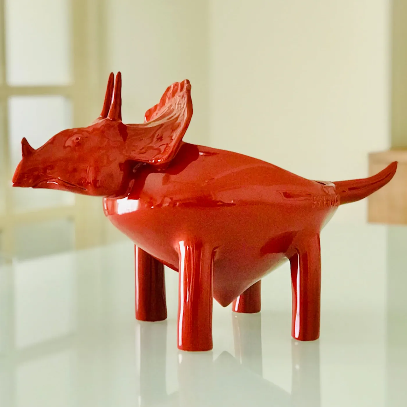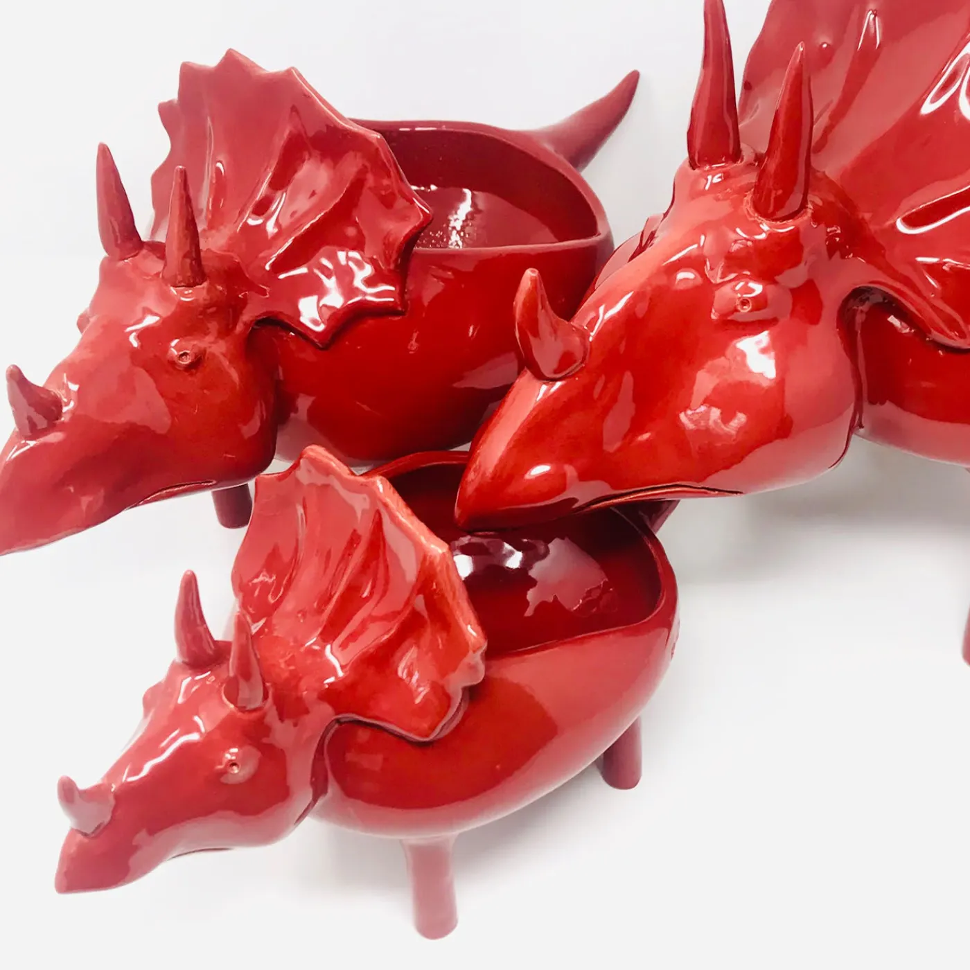 Questa stravagante e affascinante ciotola a forma di triceratopo è una maiolica dal design accattivante, perfetta per soddisfare funzioni funzionali e decorative. Gli anelli di argilla vengono sovrapposti (tecnica del “colombino”) prima di iniziare le fasi di modellatura e finitura, anch’esse minuziosamente eseguite a mano per rendere ogni pezzo davvero unico. Una prima cottura a 960°C precede quella finale a 930°C che assicura lo smalto rosso vivo. Sono disponibili anche personalizzazioni e varianti di H 27x16x21cm e H 38x18x24cm; per ulteriori dettagli, rivolgersi al Concierge.