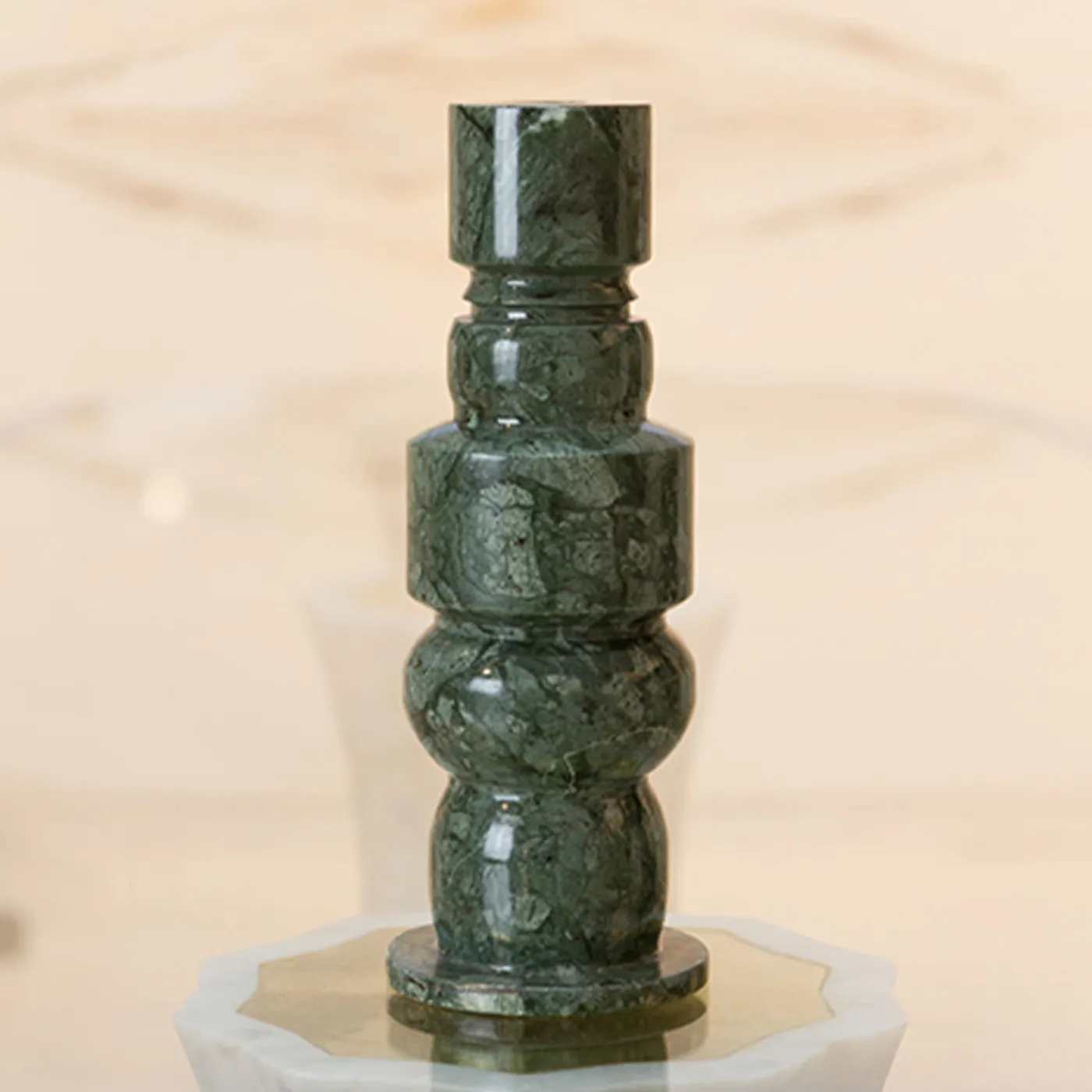 Il candeliere Oreadi Nemesi presenta un design scultoreo ricavato da un unico blocco di marmo verde del Guatemala. La lavorazione CNC di precisione crea il suo profilo distintivo con forme diverse, mettendo in evidenza le venature naturali e la profondità della pietra. Questo elegante pezzo serve sia a scopi funzionali che decorativi, valorizzando qualsiasi ambiente interno con il suo fascino lussuoso e senza tempo. Adatto per una candela di medie dimensioni, aggiunge un accento raffinato a tavoli o caminetti.