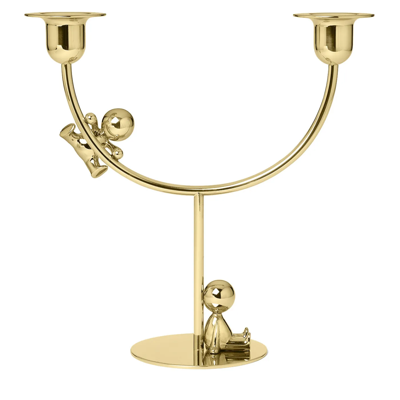 Caratterizzato da un’estetica minimalista senza tempo, questo doppio candeliere scultoreo è una rivisitazione moderna di un pezzo tradizionale dell’arredamento domestico. Realizzato in ottone lucido, il pezzo presenta due bobeches arrotondate con ampi bordi, due lunghi bracci curvi e una base piatta. Completano il pezzo due piccole statuette, una delle quali pende pigramente da un braccio, mentre l’altra è comodamente appoggiata alla colonna principale. Perfetto per esporre candele alte, questo candeliere illuminerà elegantemente qualsiasi tavolo da pranzo.