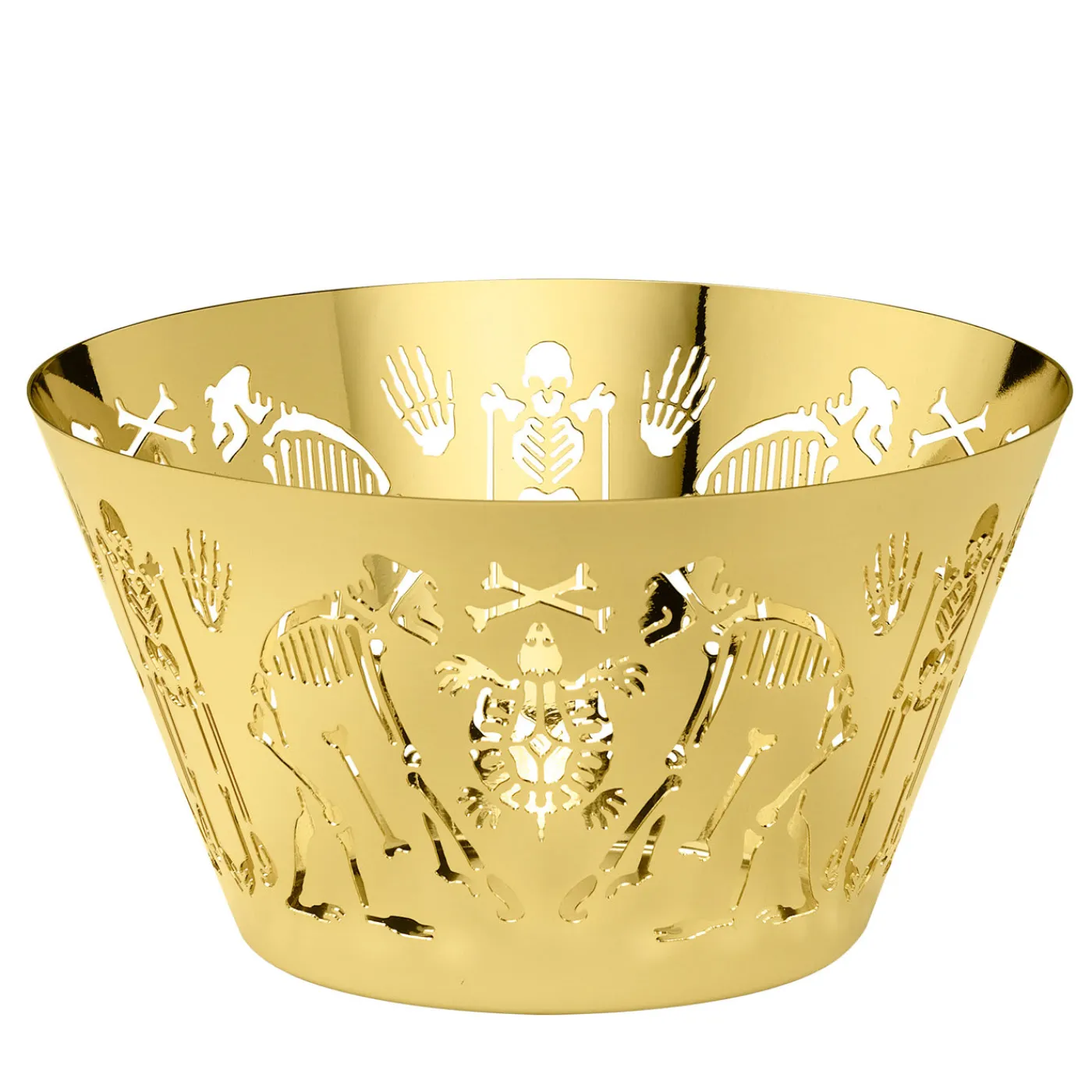 Questa grande ciotola è un superbo oggetto di arredamento funzionale che servirà elegantemente il cibo su una tavola moderna, aggiungendo al contempo un accento decorativo unico e ipnotico. Interamente realizzata in ottone, la forma conica della ciotola vanta una ghirlanda di scheletri umani, di scimmie e di tartarughe in una danza stravagante. Ideale come pezzo d’accento indipendente su un tavolo o come oggetto da collezione su un tavolino da caffè, questo pezzo farà una dichiarazione sofisticata in un interno contemporaneo insieme ad altri pezzi della serie Perished.