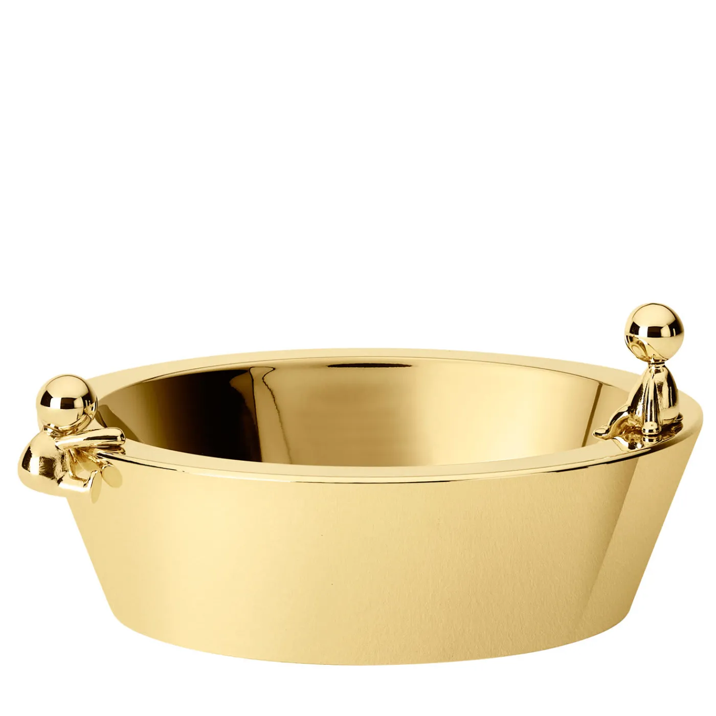 Parte della collezione Omini, questo piccolo centrotavola può fungere da elegante vide-poche in un ingresso, da versatile contenitore in un soggiorno o da ciotola di servizio in una sala da pranzo. Realizzato in ottone, questo pezzo vanta una superficie liscia sulla cui sagoma conica sembrano essersi appena arrampicate due piccole figurine. Simbolo giocoso dello stretto legame tra le persone e gli oggetti funzionali che ci circondano ogni giorno, è una presenza straordinaria in qualsiasi interno moderno.