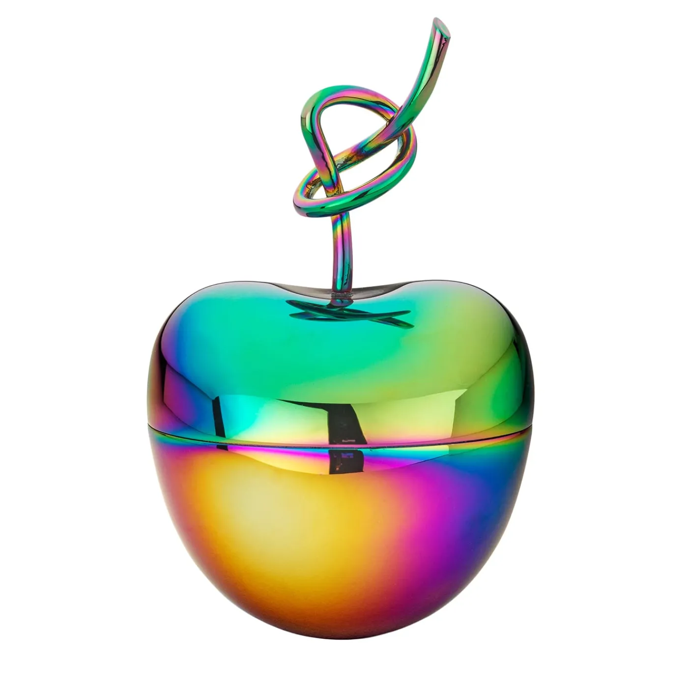 La scatola decorativa Knotted Cherry presenta un caratteristico design a stelo annodato su un contenitore liscio e arrotondato ispirato alla forma di una ciliegia. La sua finitura riflettente e multicolore conferisce una qualità vibrante e iridescente che cattura e gioca con la luce. La scatola funge da elegante soluzione per riporre tesori personali o ricordi, combinando un design stravagante con la funzionalità per creare un pezzo accattivante per qualsiasi interno.