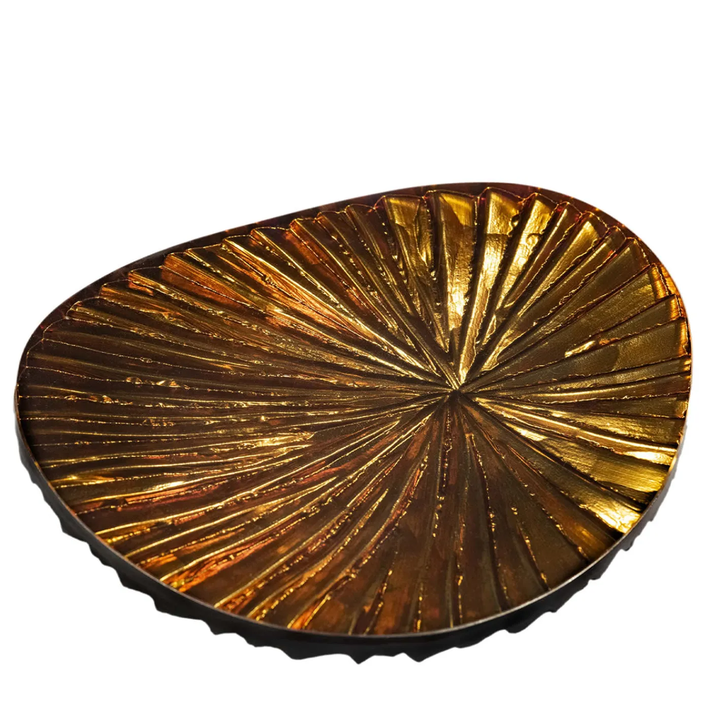 Questo prodotto ha un design contemporaneo ideale per dare uno stile inconfondibile a qualsiasi ambiente. La forma triangolare arrotondata conferisce sobrietà ed eleganza, mentre il caldo colore ambrato intenso impreziosito da riflessi dorati lo rende ancora più raffinato. Questo elemento è una vera e propria scultura in quanto è stato curvato, tagliato e scolpito a mano. Ogni pezzo è unico e, a causa della lavorazione artigianale, possono verificarsi lievi variazioni.