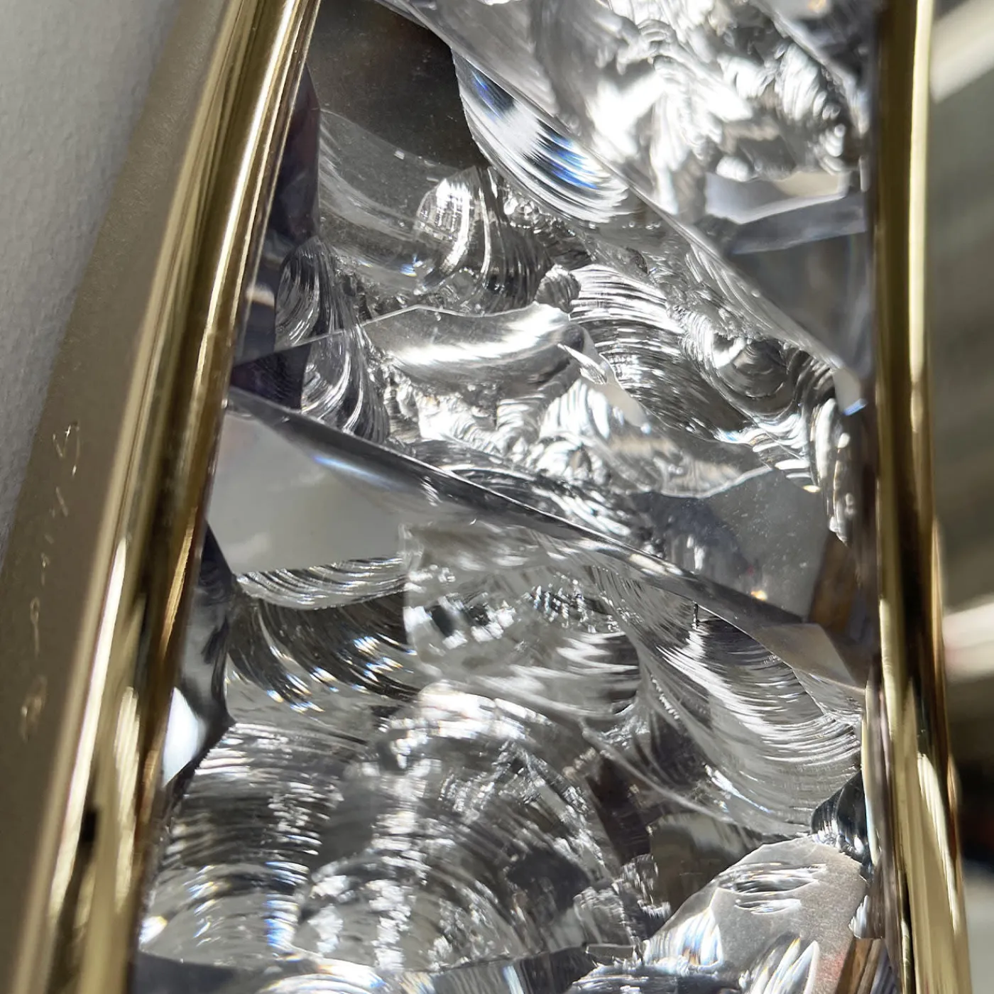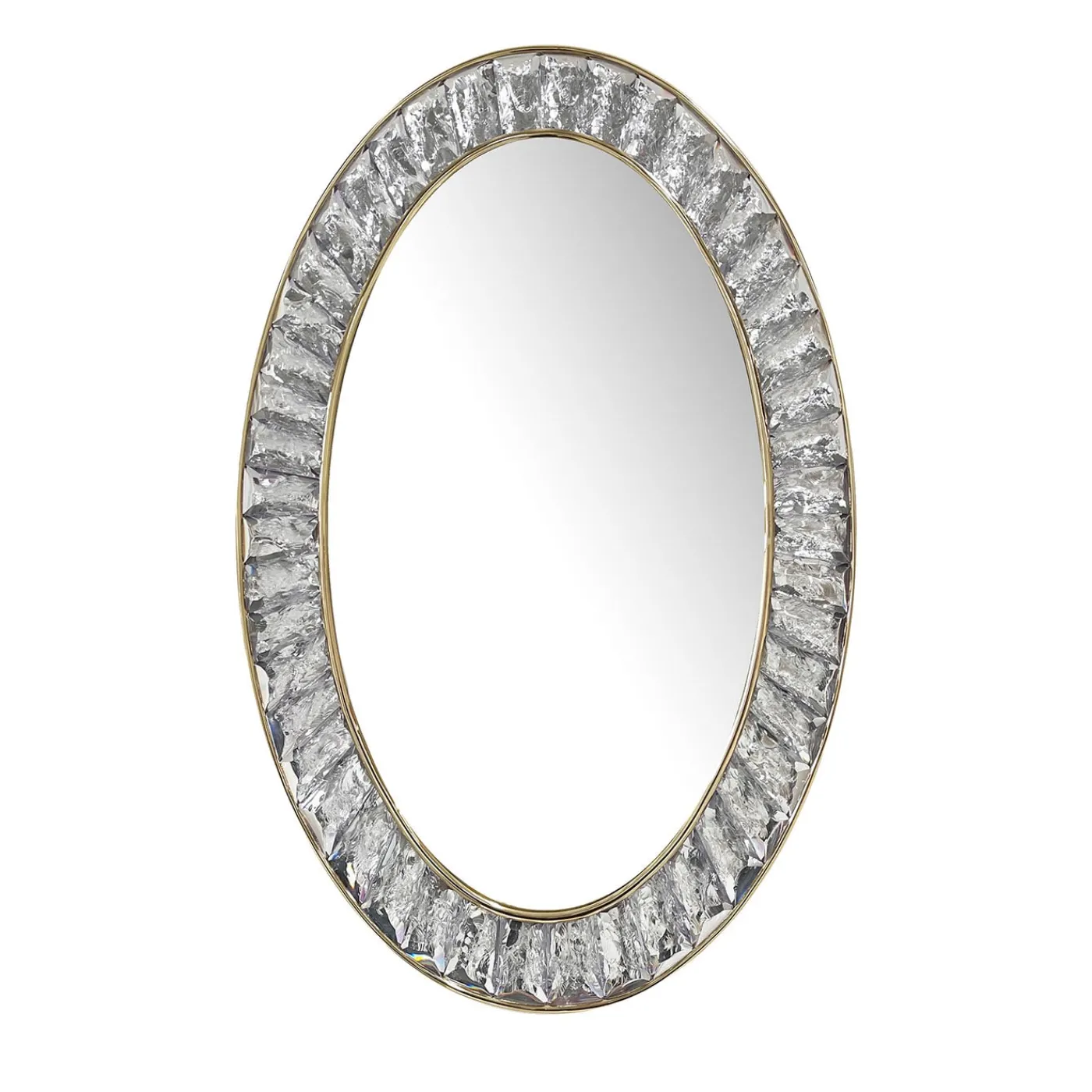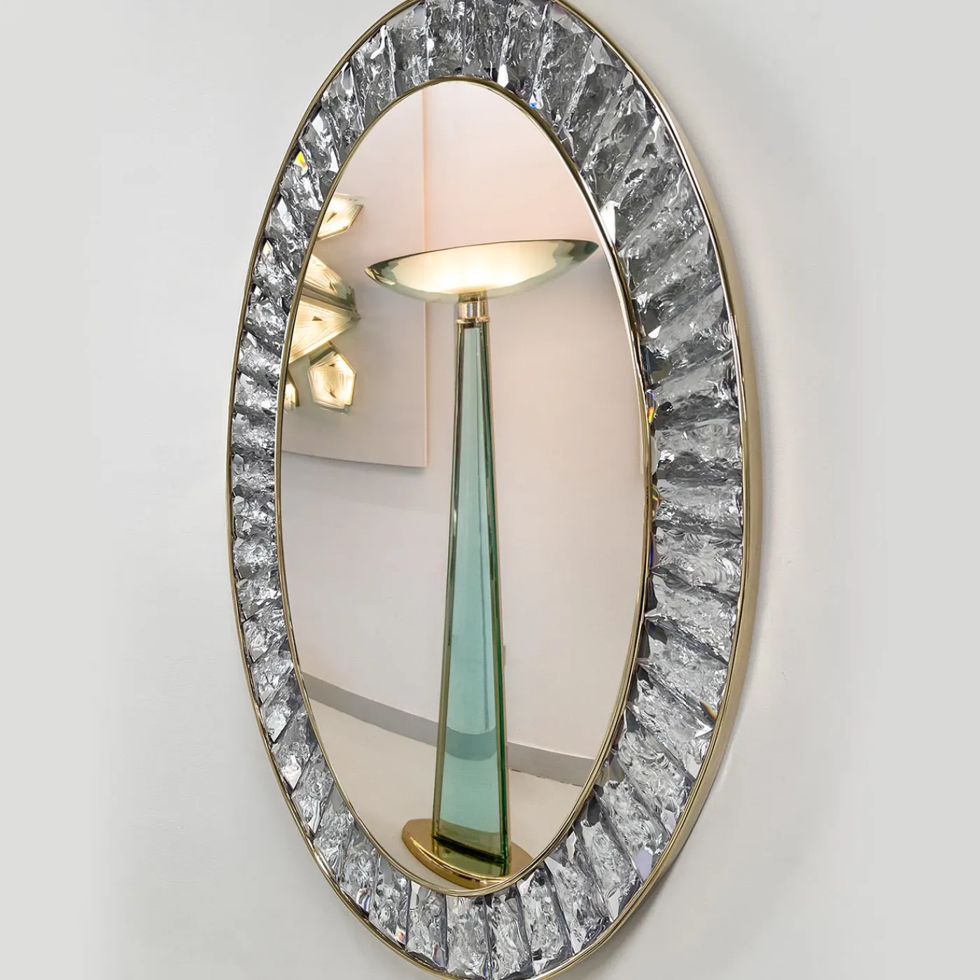 Lo specchio da parete Martelè è un oggetto artistico di pura arte e design italiano. La struttura portante è in ottone placcato oro lucido 24 kt. La cornice ovale dello specchio è composta da tessere di cristallo intagliate a mano e disposte con precisione l’una accanto all’altra. Il cristallo lavorato è ricco di riflessi di luce che rendono questo specchio non solo luminoso ma anche elegante e originale. La lavorazione artigianale e artistica rende questo oggetto una creazione unica. A causa della lavorazione artigianale, possono verificarsi lievi variazioni.