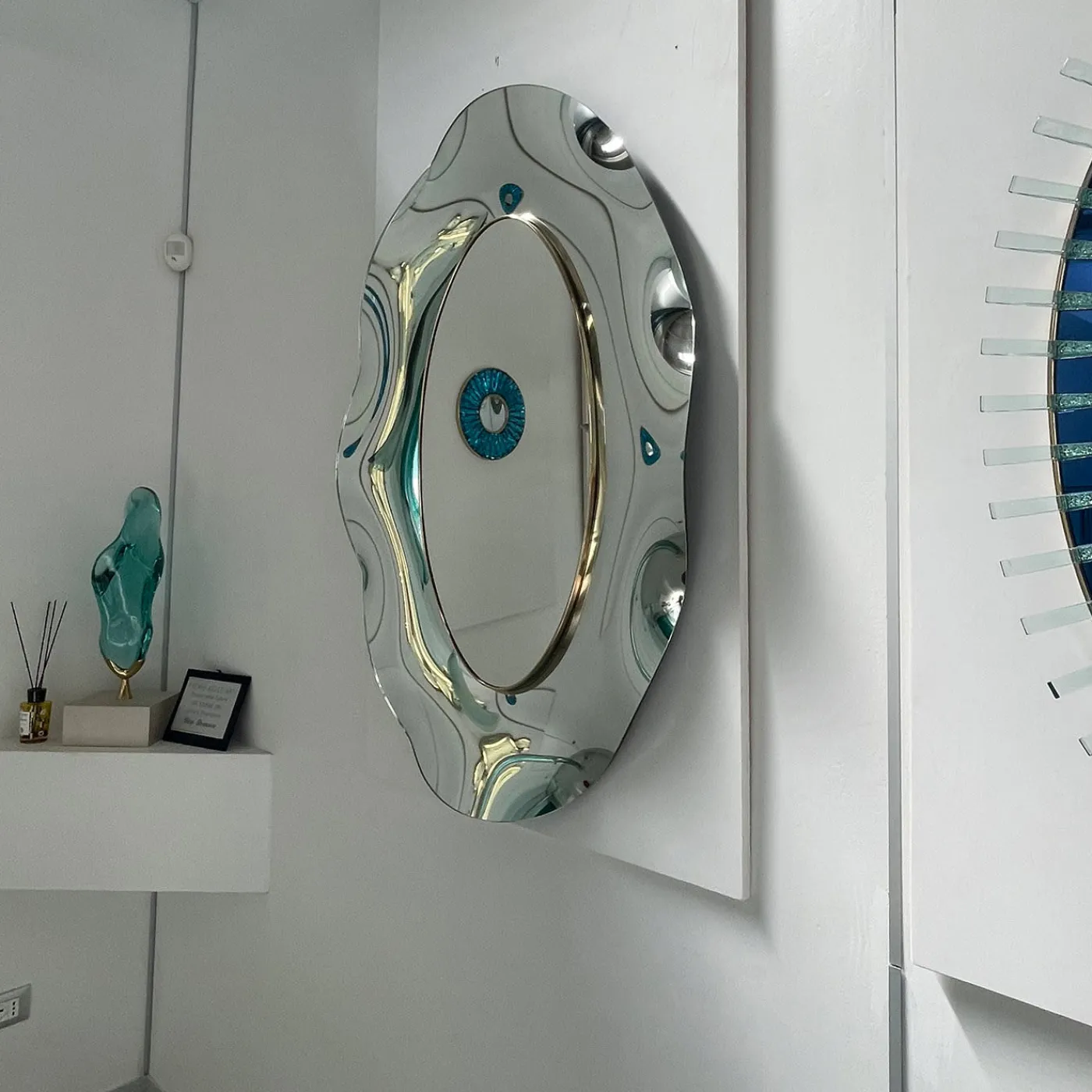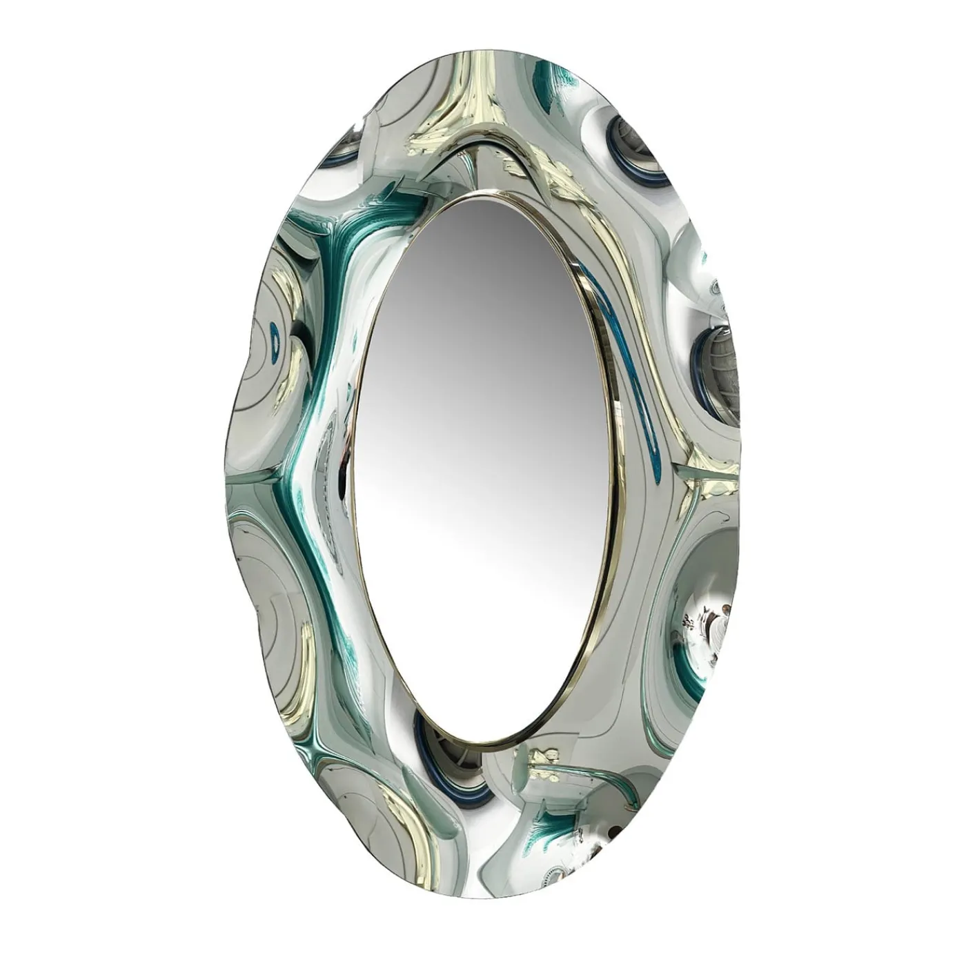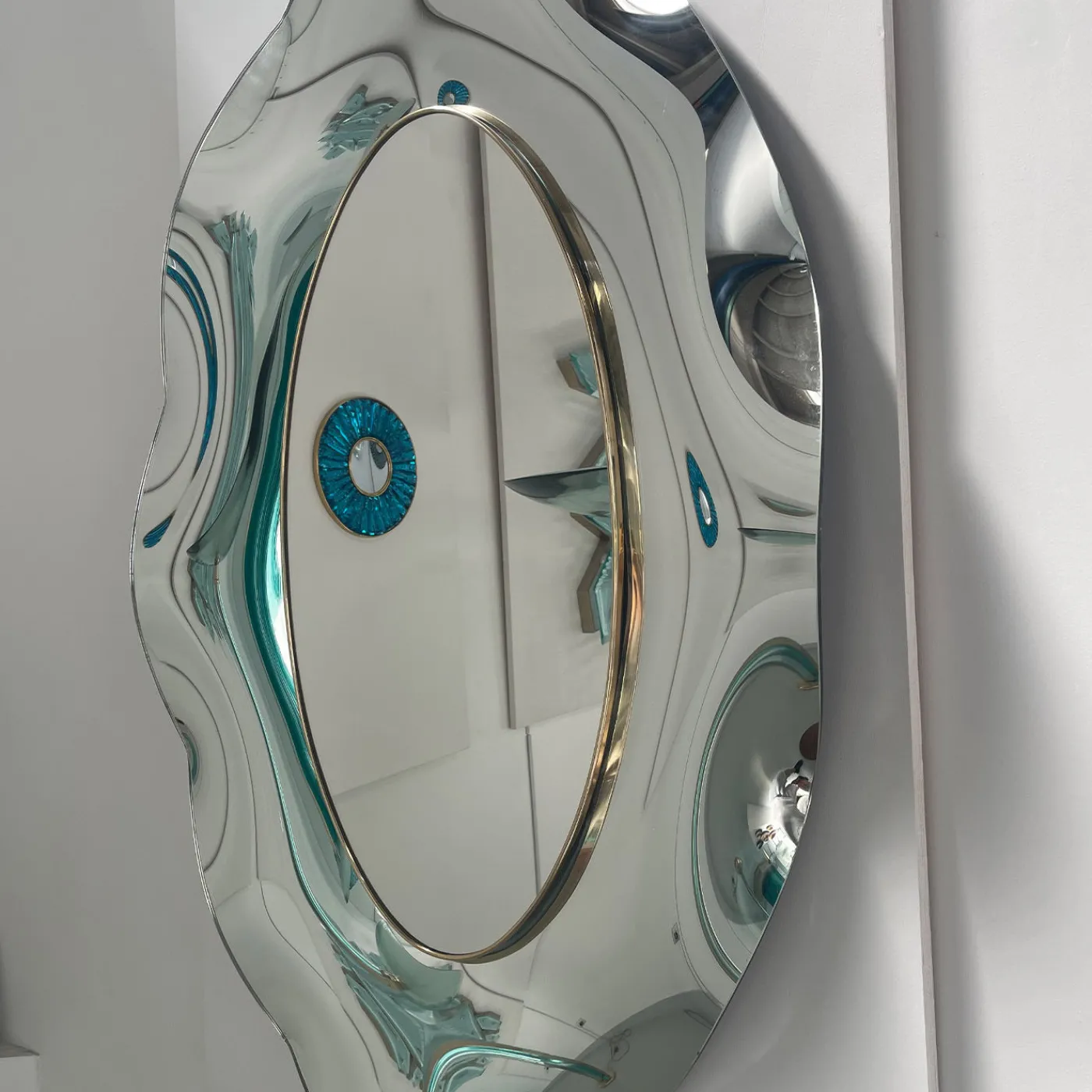 Lo specchio ondulato “Undulate” è la sintesi perfetta di stile senza tempo, design innovativo ed eccellenza artigianale italiana. Il cristallo è stato lavorato a mano e sapientemente curvato dall’artista. La struttura di supporto è in legno e ottone. Il metallo è placcato oro 24 carati e la forma ovale e la finitura argento conferiscono eleganza e luminosità. Ogni imperfezione è garanzia di estrema naturalezza e artigianalità. A causa della lavorazione artigianale, possono verificarsi lievi variazioni.