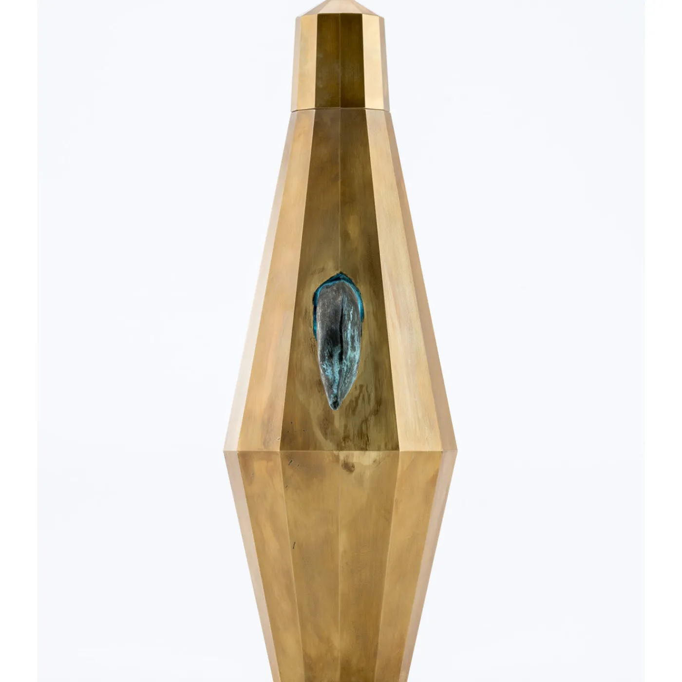 Un inserto metallico in rame che ricorda il becco di un uccello è stato riscaldato, martellato e incastonato nel corpo di questo vaso di squisita fattura. Per la creazione di questo pezzo è stata utilizzata una tecnica unica, in cui fogli di ottone ossidato a mano vengono formati con una macchina da taglio CNC. Vengono creati bordi affilati e forme geometriche precise che, in combinazione con la forma alta ed elegante di questo pezzo, accentuata dall’inserto in rame, rendono il vaso uno spettacolo squisito da vedere.