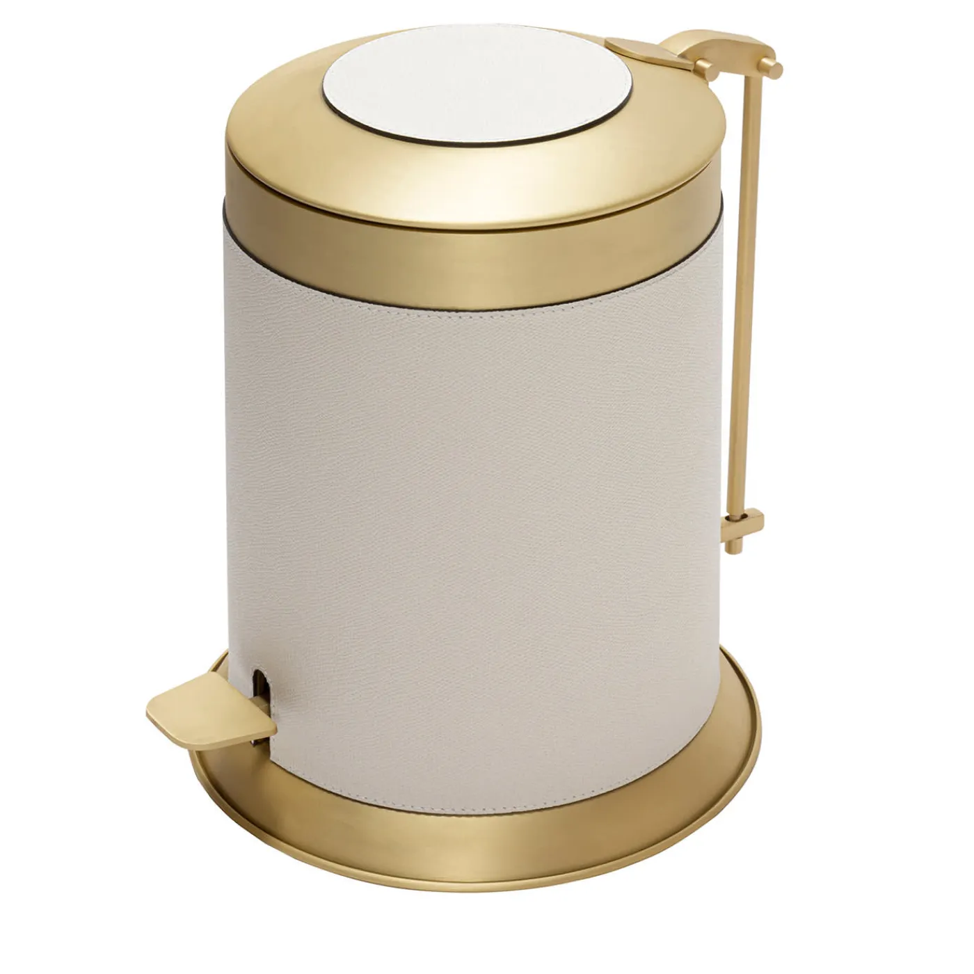 Struttura in metallo disponibile in diverse finiture con inserti in pelle. Contenitore interno rimovibile in metallo laccato scuro per una facile pulizia.