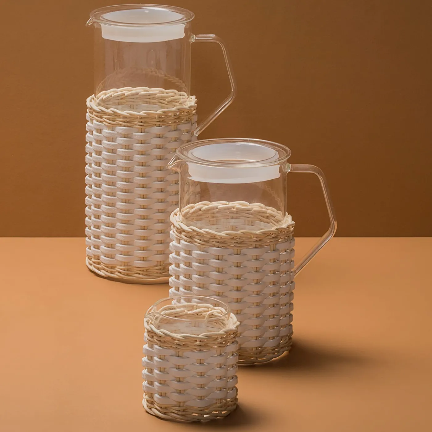 Vetro borosilicato trasparente parzialmente rivestito di pelle e rattan intrecciati. Disponibile solo con rattan naturale abbinato a golf o nappa.