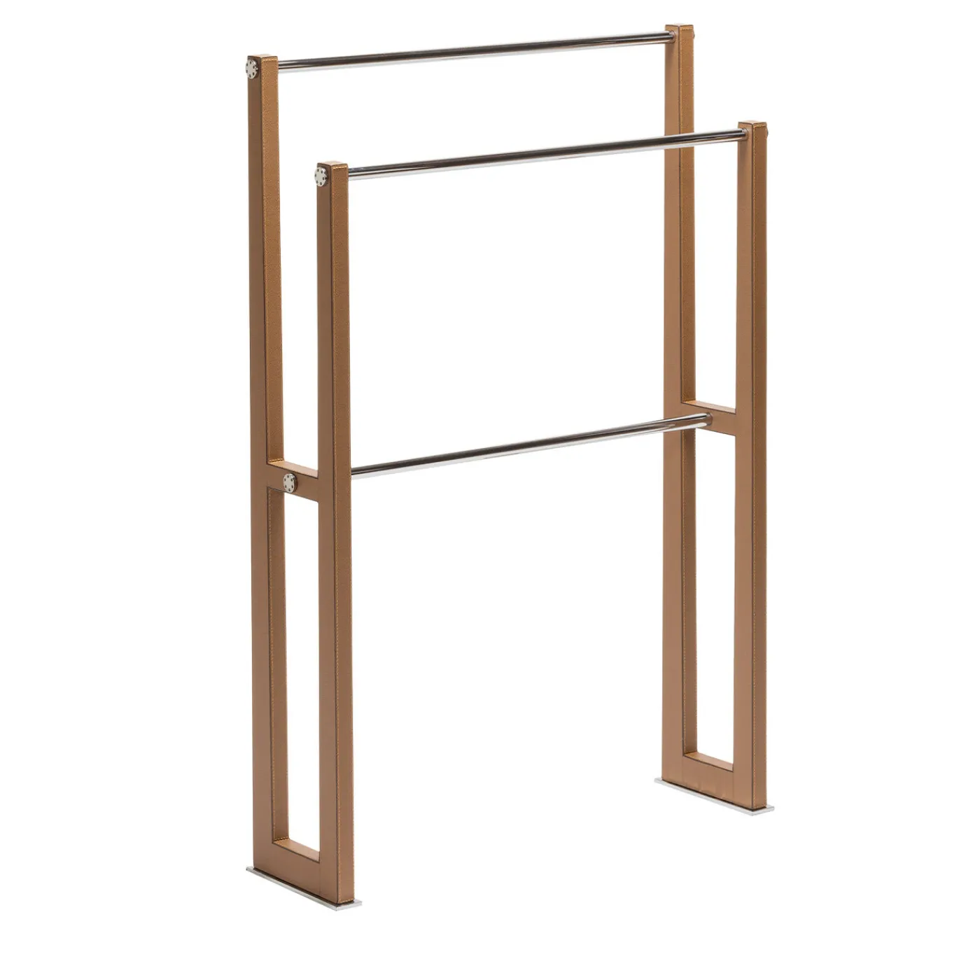 Splendido pezzo d’accento per un bagno contemporaneo o moderno di un’abitazione privata, di un hotel o persino di uno yacht, questo portasciugamani si farà notare grazie ai suoi materiali raffinati e all’allure minimalista. Montato su una struttura in legno rivestita in pelle, il pezzo presenta tre barre metalliche orizzontali rifinite con un effetto cromato lucido, disponibile anche in bronzo o ottone su richiesta. Le dimensioni sono personalizzabili, per maggiori dettagli rivolgersi al Concierge.