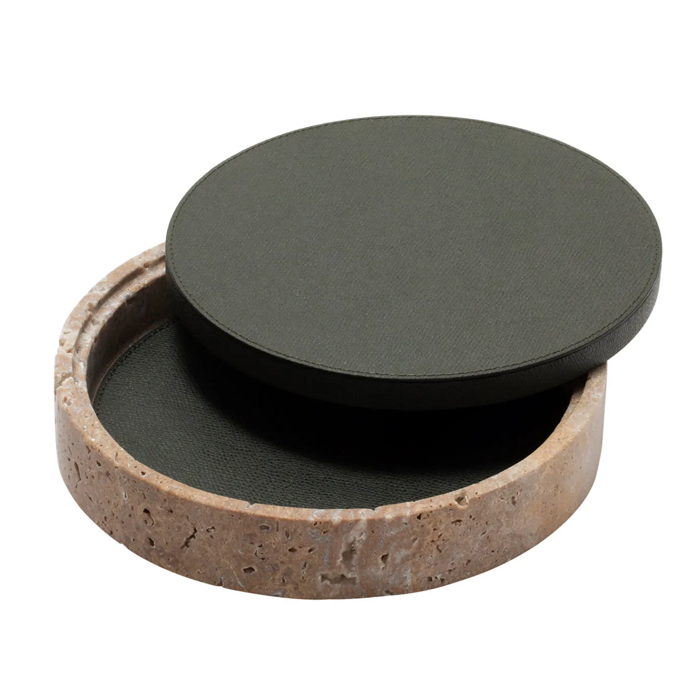 Caratterizzate da forme geometriche minimali, queste scatole combinano la bellezza del travertino in diverse sfumature di scelta con la migliore pelle italiana. Le dimensioni personalizzate sono disponibili su richiesta.